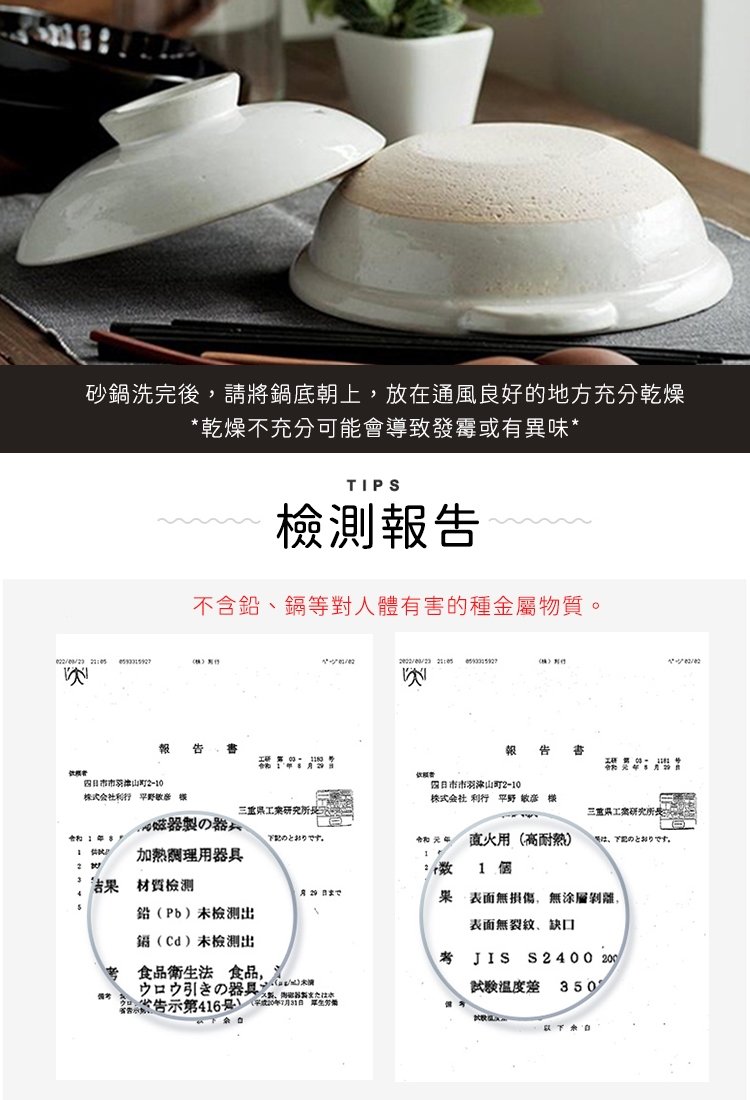 4.台灣氣候潮濕,陶鍋使用過後,請用溫熱水、中性清潔劑清洗,洗完後馬上用乾淨的乾布把內外擦乾後,放置到通風處,並將士鍋鍋底朝上放置以儘快晾乾,去除隱藏在陶士縫隙內的水氣。