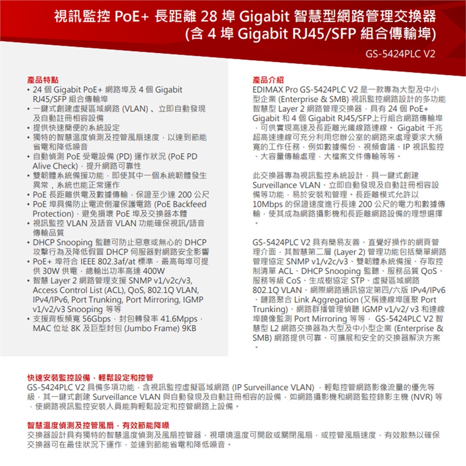 • 24個 Gigabit PoE+ 網路埠及 4 個 Gigabit