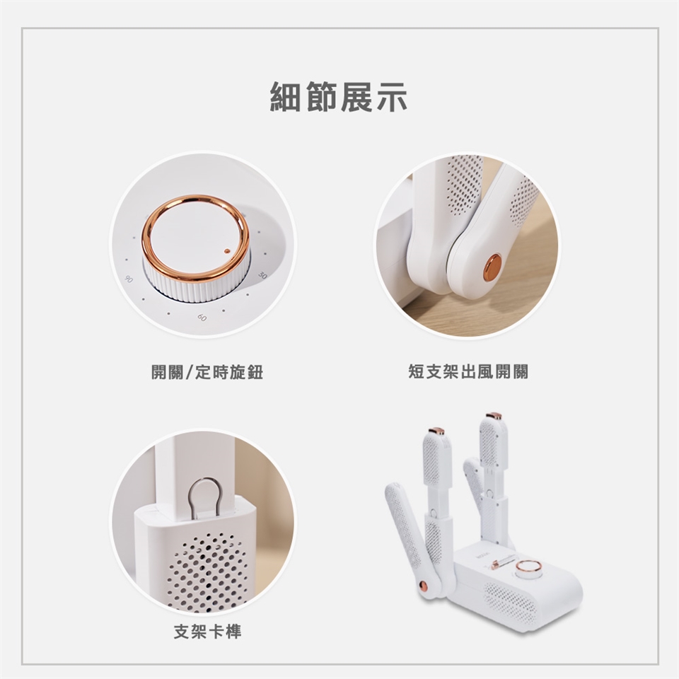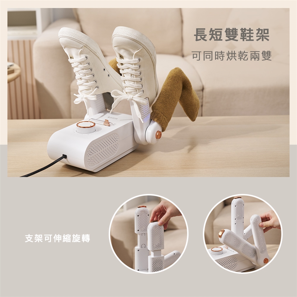 - 長短雙鞋架,可同時烘乾兩雙。