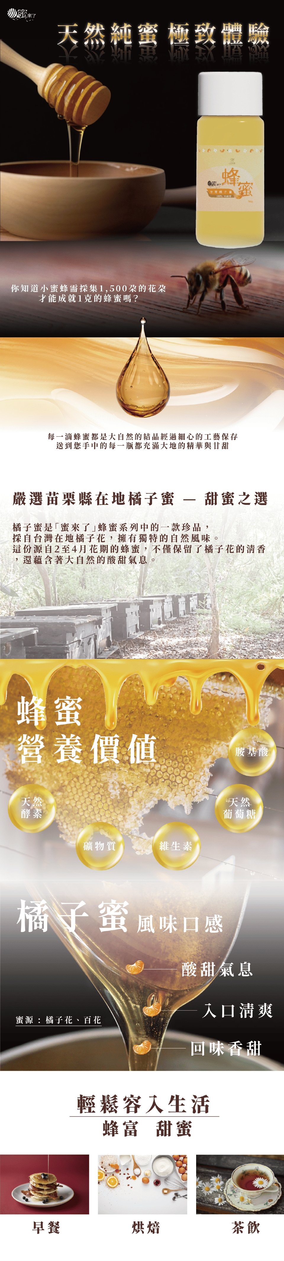 ◆茶飲搭配:無論是綠茶、紅茶還是花草茶,一小勺橘子蜜就能提味增香,為您的茶時光增添一絲自然甜蜜。
