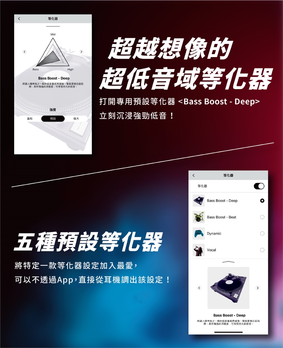 想進⼀步感受聲⾳的深度的⼈,則可開啟專⽤等化器「Bass Boost - Deep」體驗讓⼈難以想像是⼩巧耳機帶來的超低頻表現⼒。