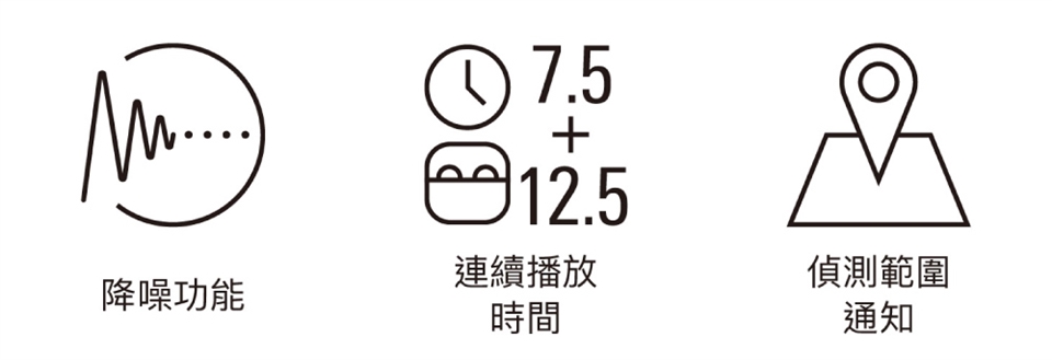 關閉降噪功能時,耳機本體播放時長可達 7.5 ⼩時,搭配充電盒⼀起使⽤時則可達 20 ⼩時。