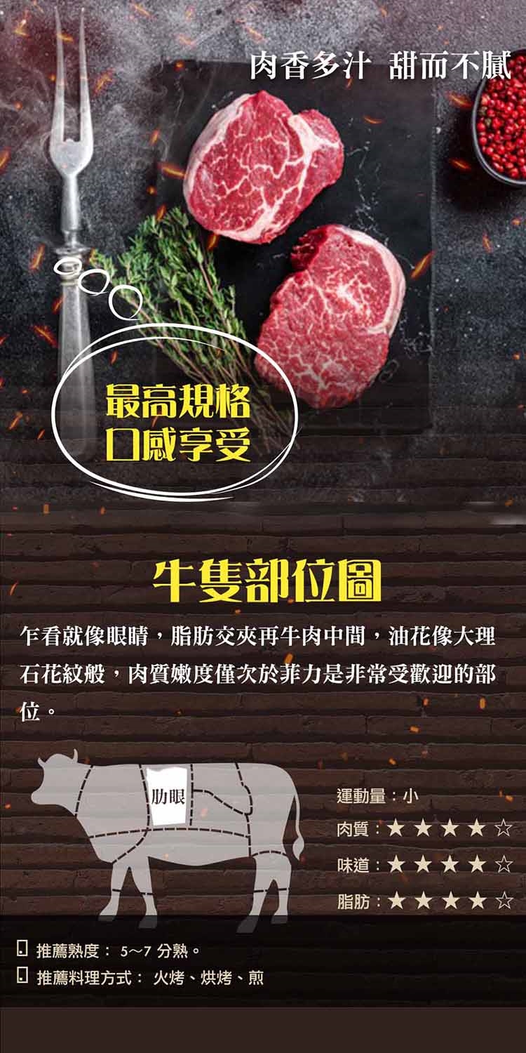 四、無任何添加及醃漬嫩化,最佳賞味熟度為5-7分熟,熟度愈高肉質愈有嚼勁.