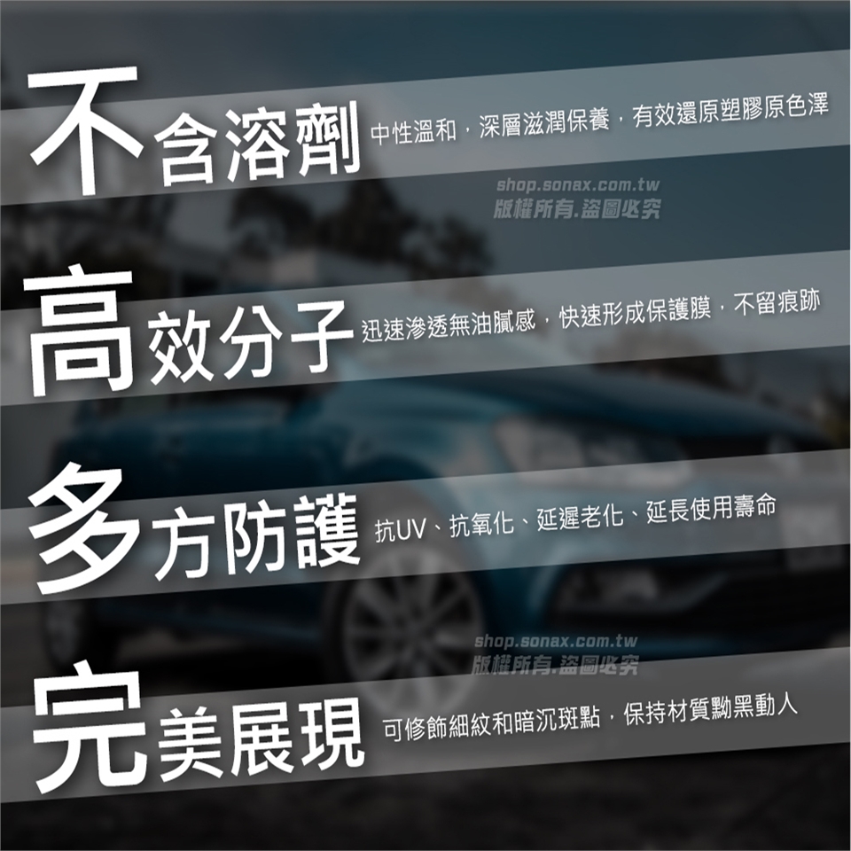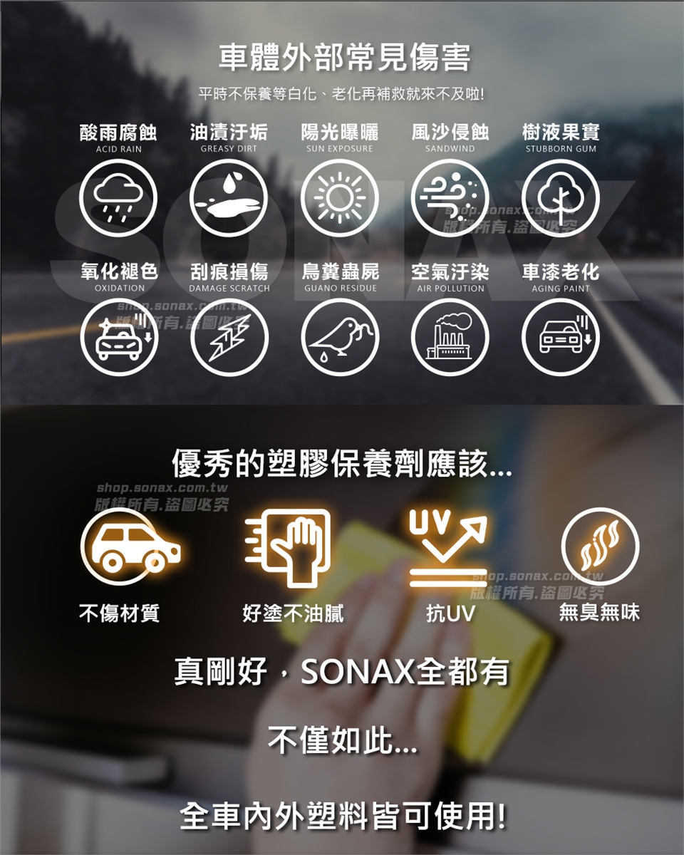 請勿使用於玻璃、烤漆、紡織品、電子配備、方向盤、踏板和變速器。