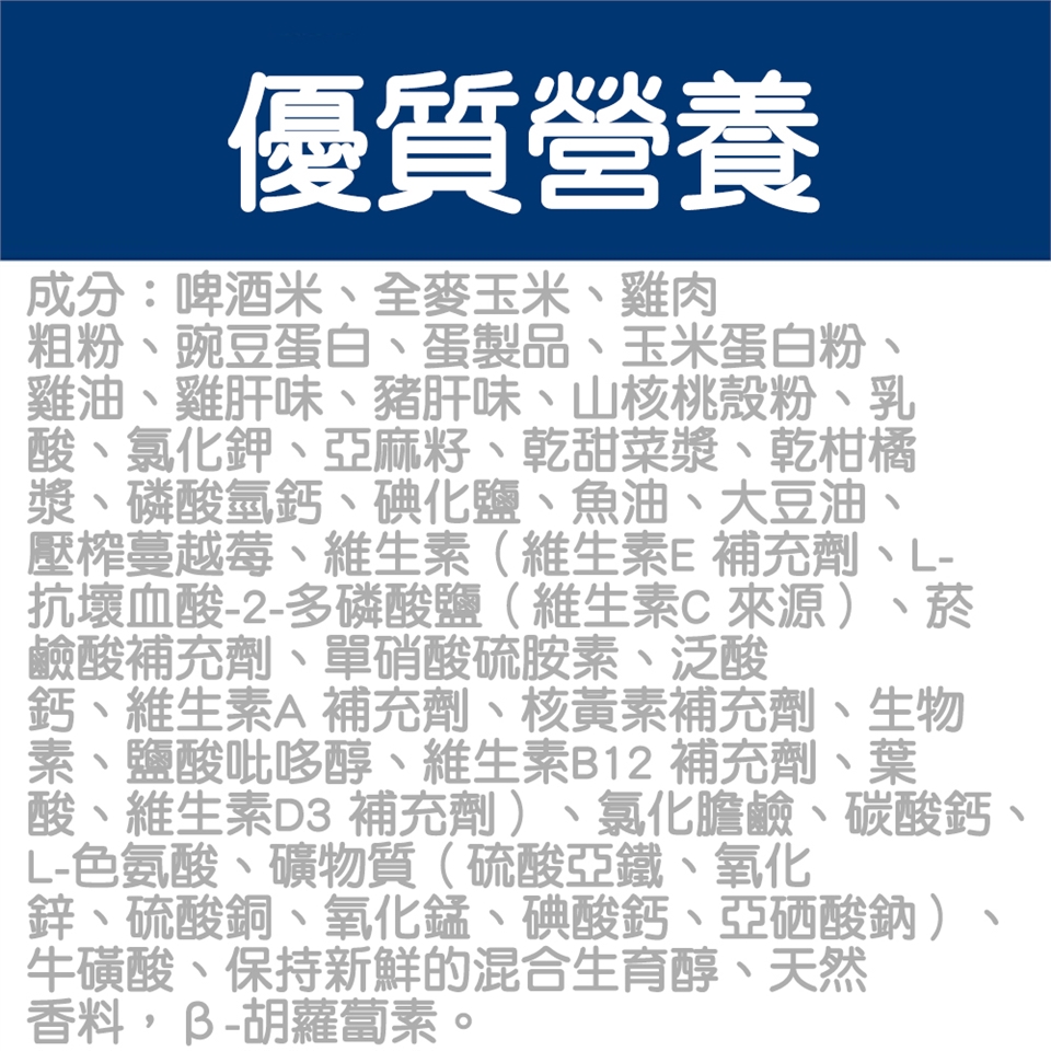啤酒大米,全穀物玉米,雞粉,豌豆蛋白,蛋製品,豬肉脂肪,玉米麵筋粉,雞肝味,甜菜漿,乳酸,豬肝味,豆油,氯化鉀,碘化鹽,磷酸二鈣,維生素(維生素E補充劑,L-抗壞血酸-2-聚磷酸鹽(維生素C的來源),菸酸補充劑,硫胺素硝酸鹽,維生素A補充劑,泛酸鈣,核黃素補充劑,維生素B12補充劑,鹽酸吡ox醇,生物素,葉酸,維生素D3補品),碳酸鈣,車前子殼,氯化膽鹼,L-色氨酸,牛磺酸,礦物質(硫酸亞鐵,氧化鋅,硫酸銅,氧化錳,碘酸鈣,亞硒酸鈉),混合生育酚,新鮮度,天然香料,β-胡蘿蔔素。