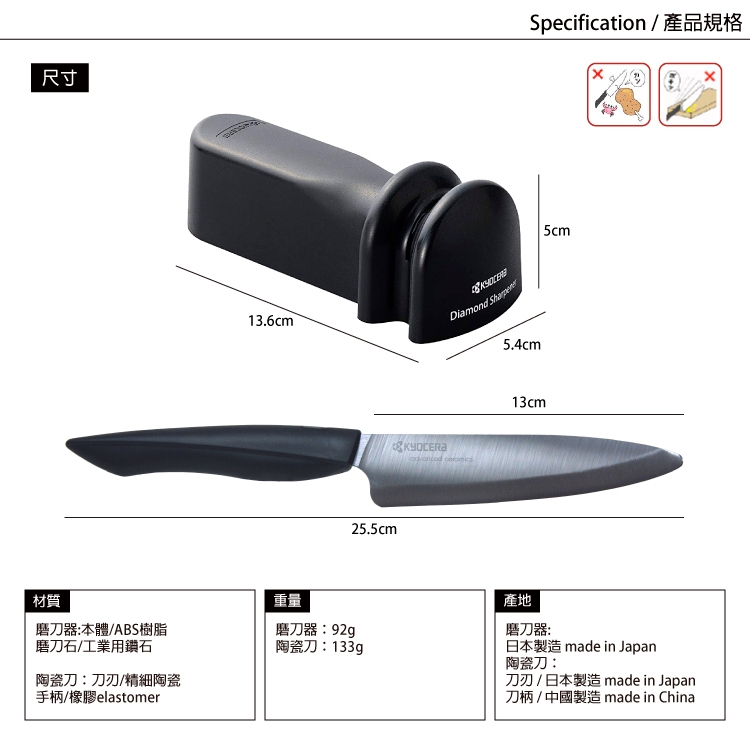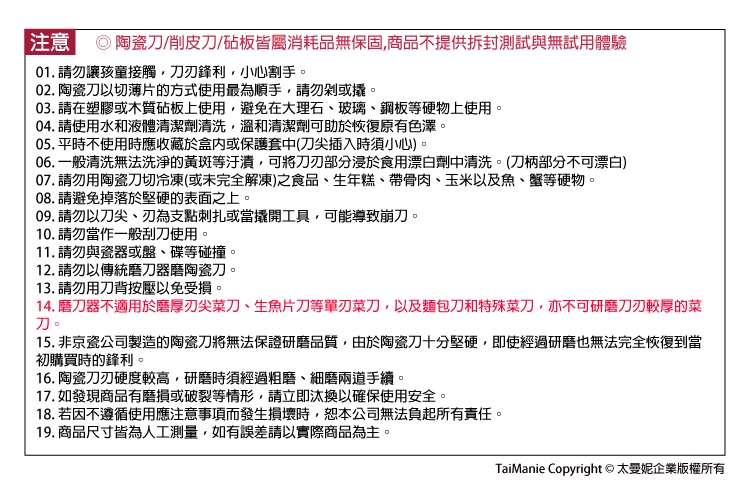15. 非京瓷公司製造的陶瓷刀將無法保證研磨品質,由於陶瓷刀十分堅硬,即使經過研磨也無法完全恢復到當初購買時的鋒利。