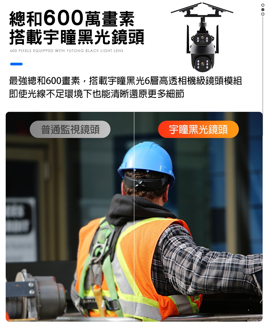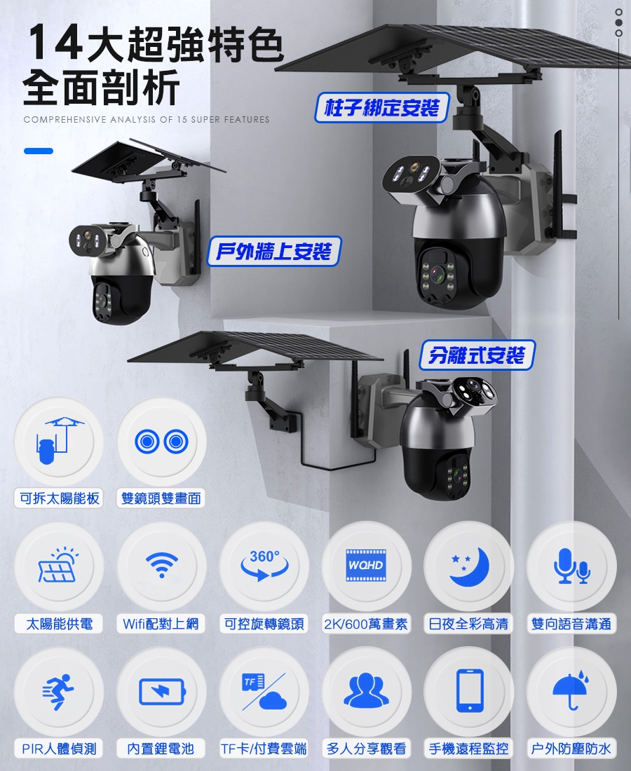 ●太陽能充電、擺頭監視、使用WIFI連線、日夜全彩