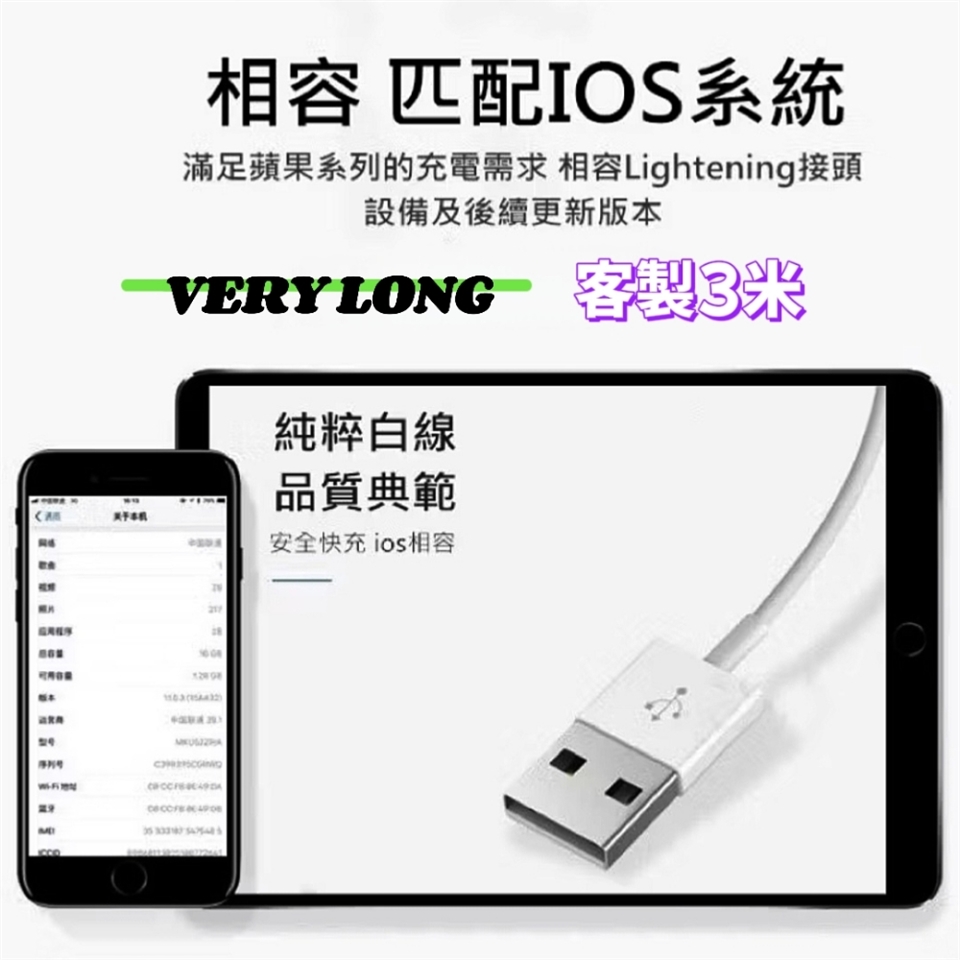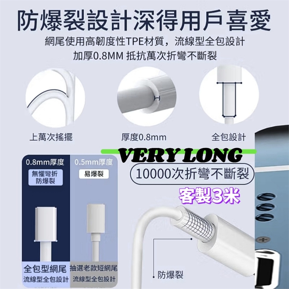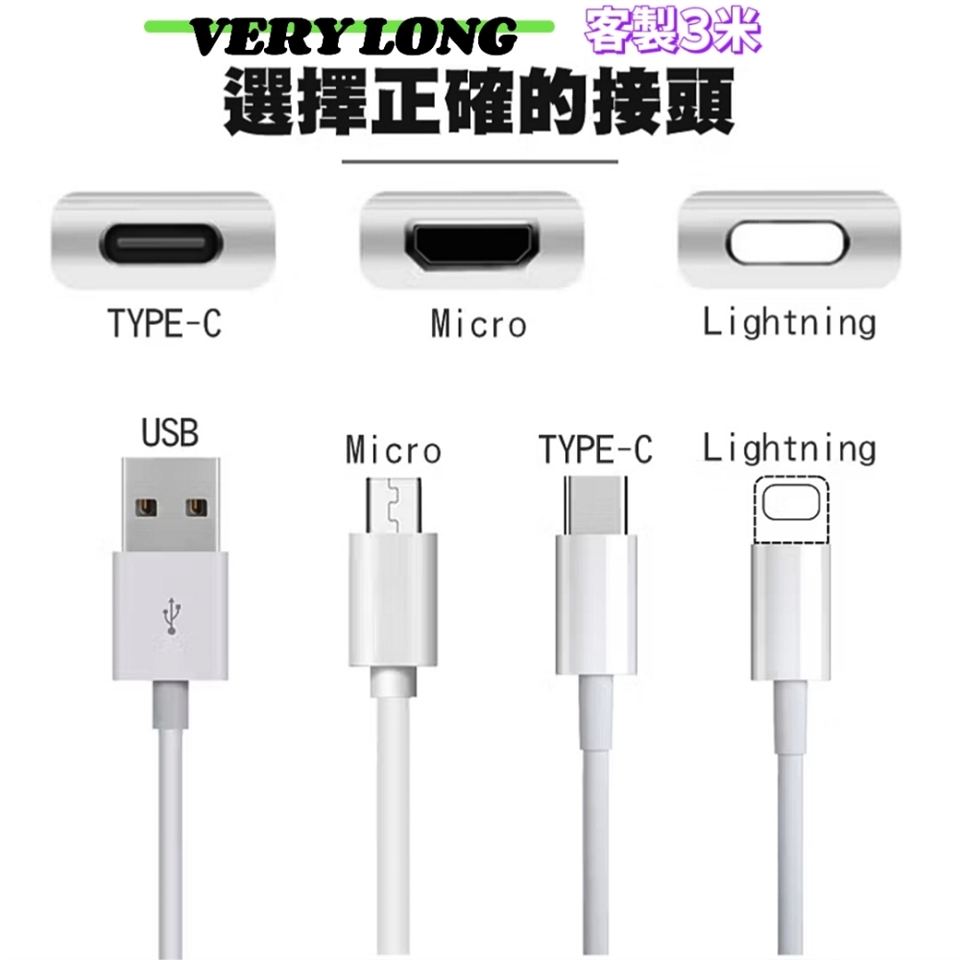 客製化加長3米,市售最長充電線,滿足您手機運用更自由