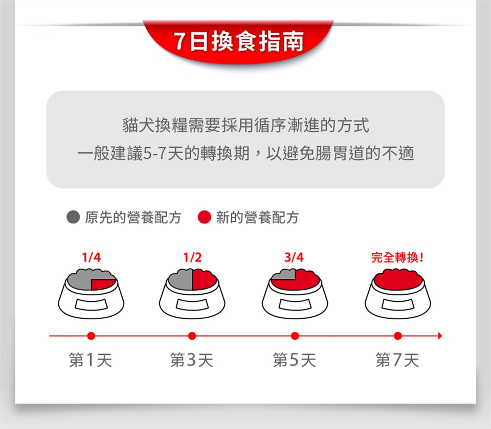 1.首次餵食本產品建議以七天為轉換期,原使用產品與本產品混合餵食,循序漸進至轉換完成。