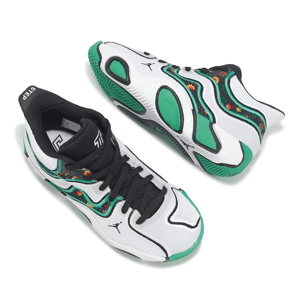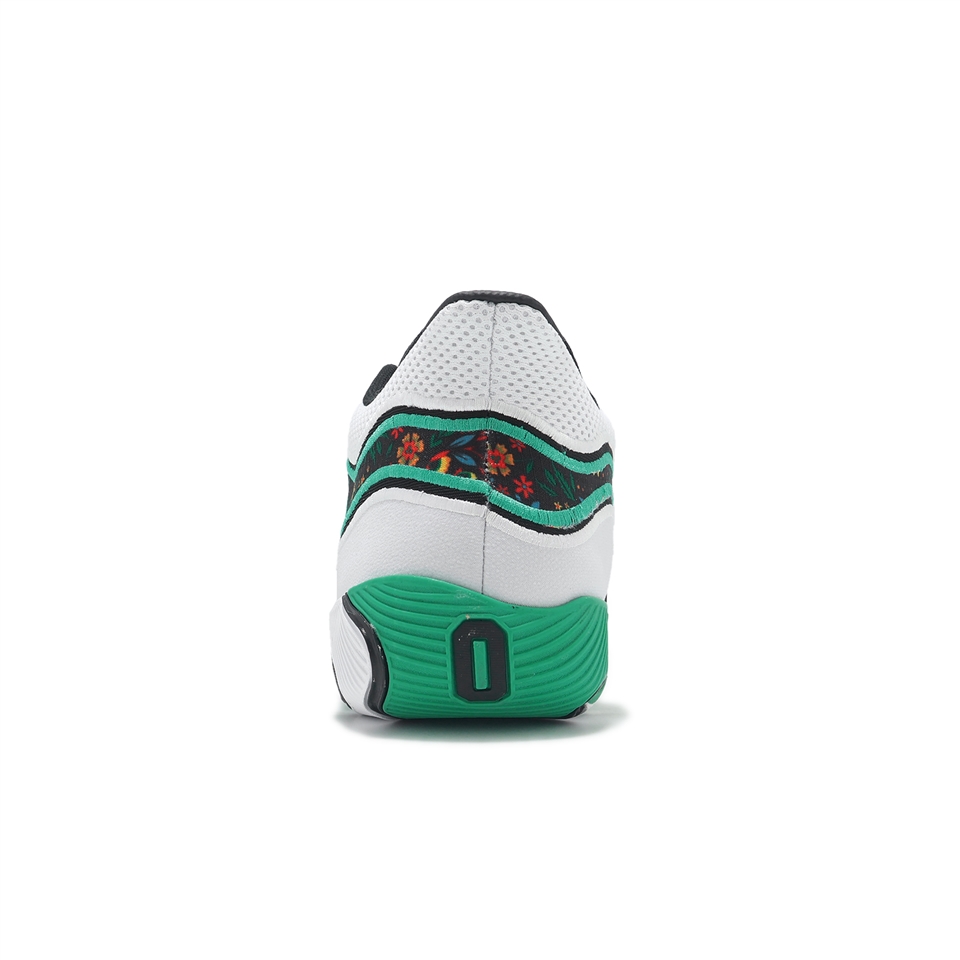 * 首發配色以Welcome to the Garden配色來呼應賽爾提提客隊主場TD Garden,將此段文字紋在後跟鞋提處,鞋款以黑白綠作為搭配,中間點綴花卉圖案。