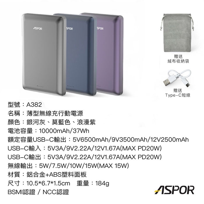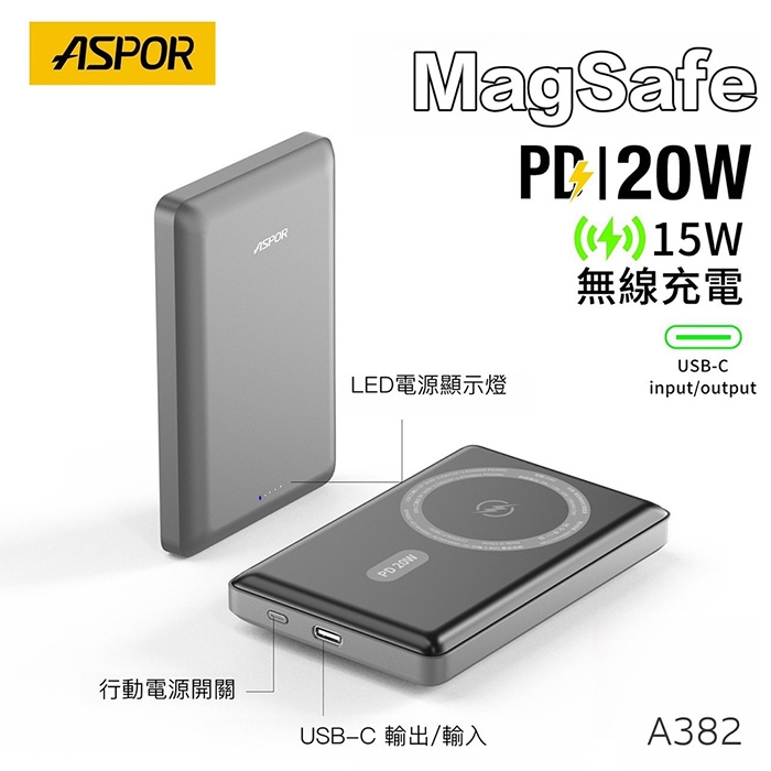 ASPOR 金屬超薄款/10000mAh/PD 20W/15W磁吸式無線閃充行動電源A382