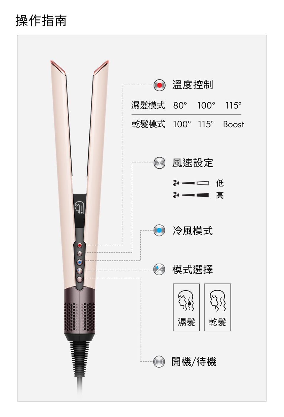 4. 三段式溫度調整:分為濕髮模式:80°C, 110°C, 140°C /乾髮模式:120°C, 140°C, boost 160°C同時每秒偵測溫度30次