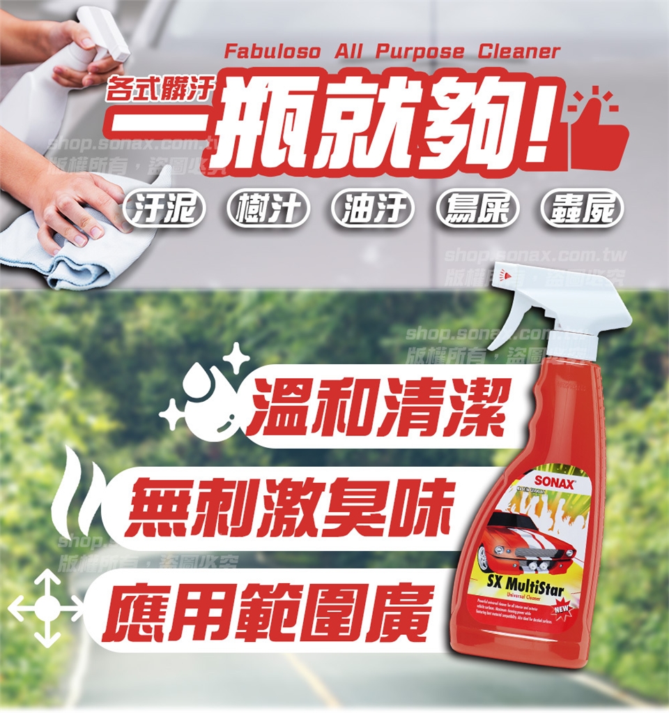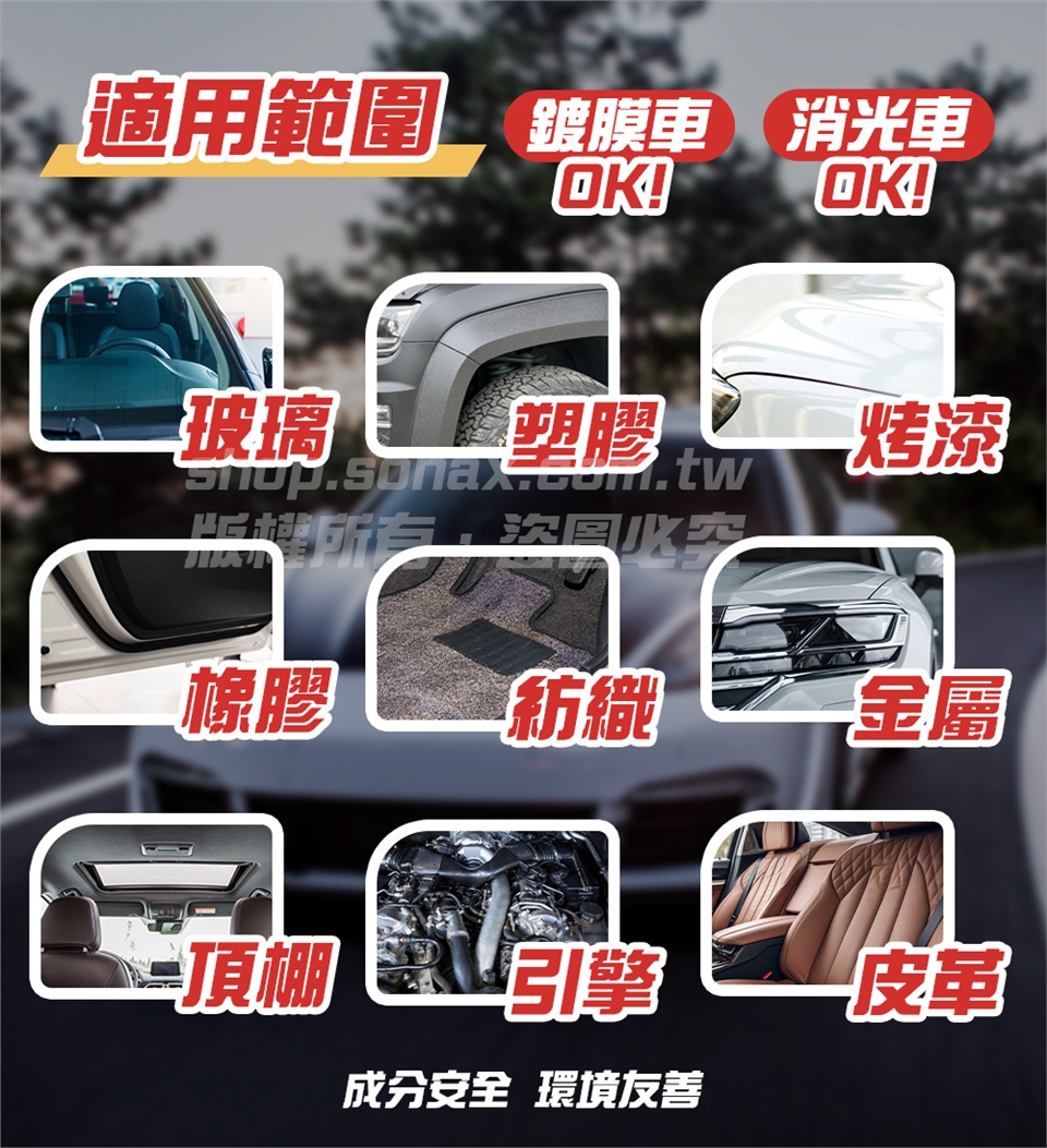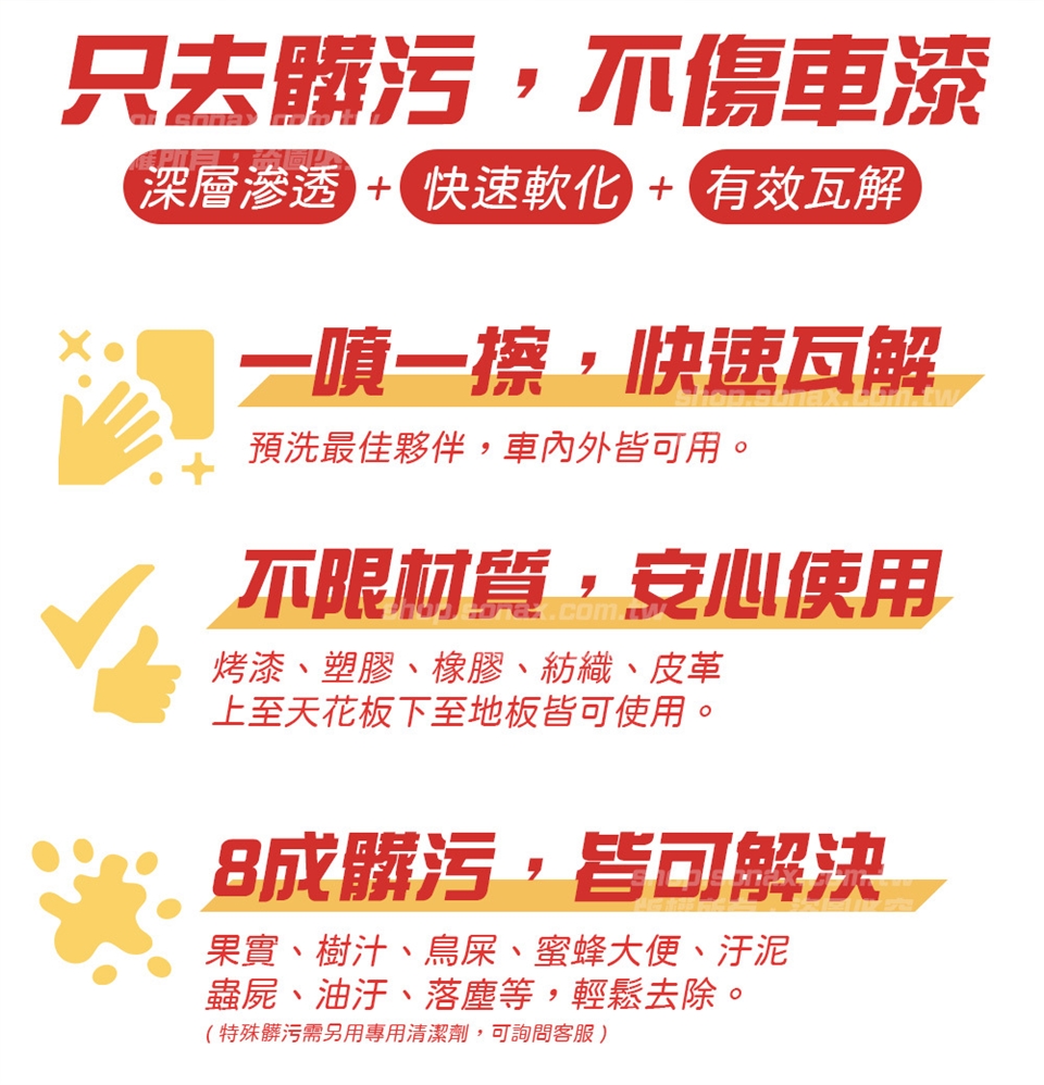 噴於車身表面較髒汙區塊,溶解軟化外來髒汙的附著,如昆蟲屍斑、鳥糞、蜜蜂大便等,再進行全車細部高壓沖水,