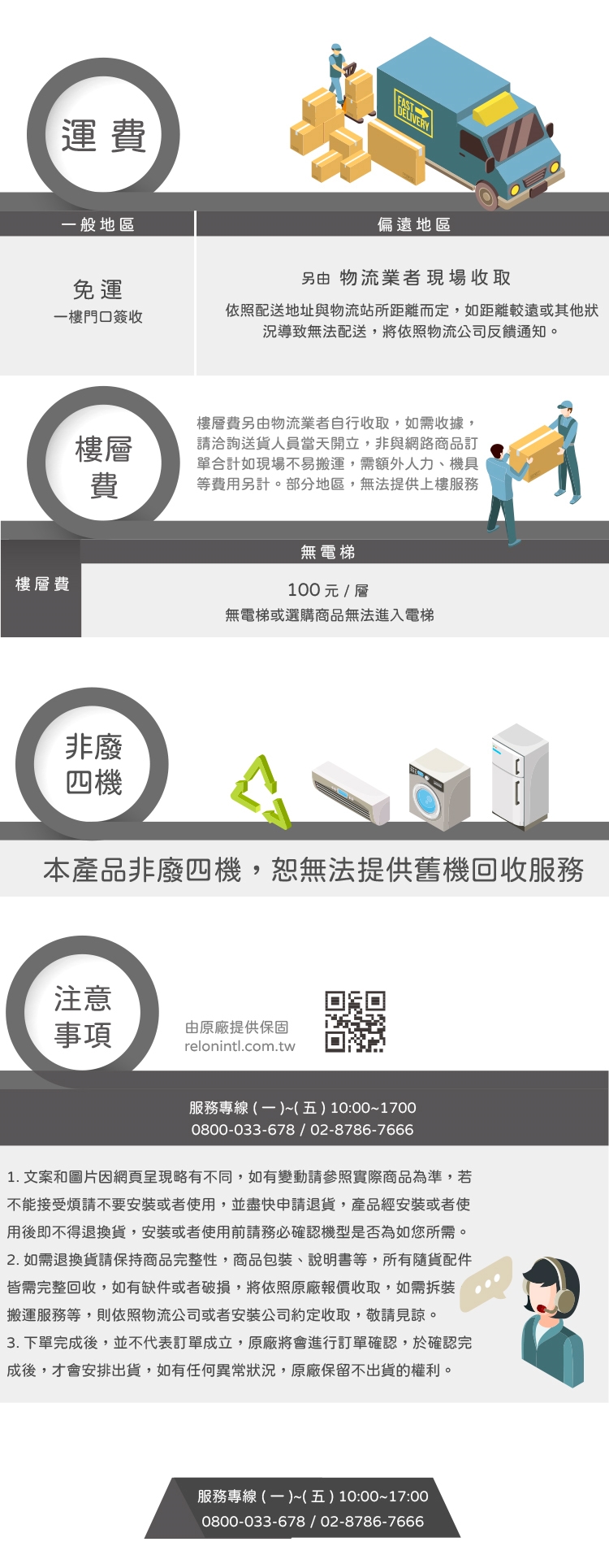 4.本商品免費運送到府不含安裝、不含拆箱定位及無舊機回收服務。