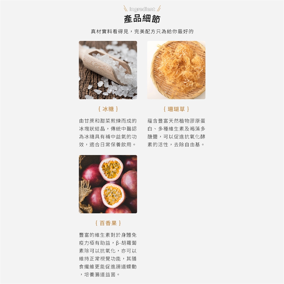 成分:冰糖、珊瑚草、百香果、己二烯酸(防腐劑)