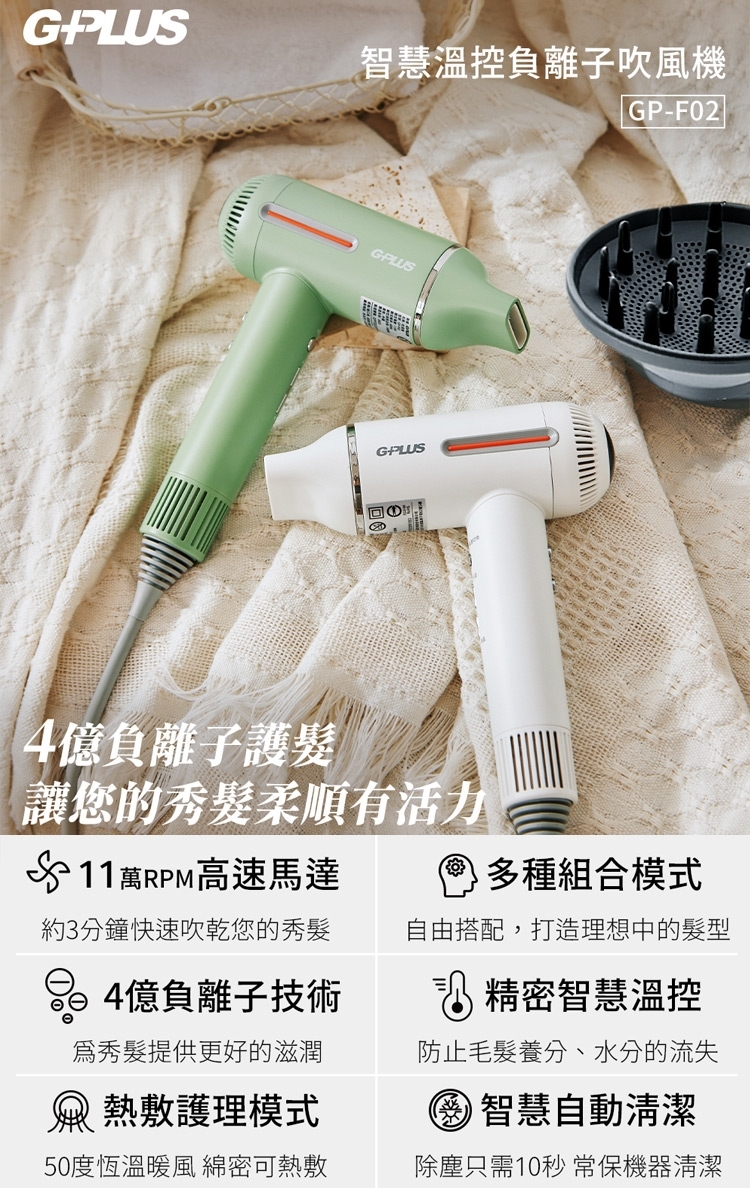 【G-PLUS 拓勤】GP-F02 智慧溫控負離子吹風機(捲髮烘罩組)