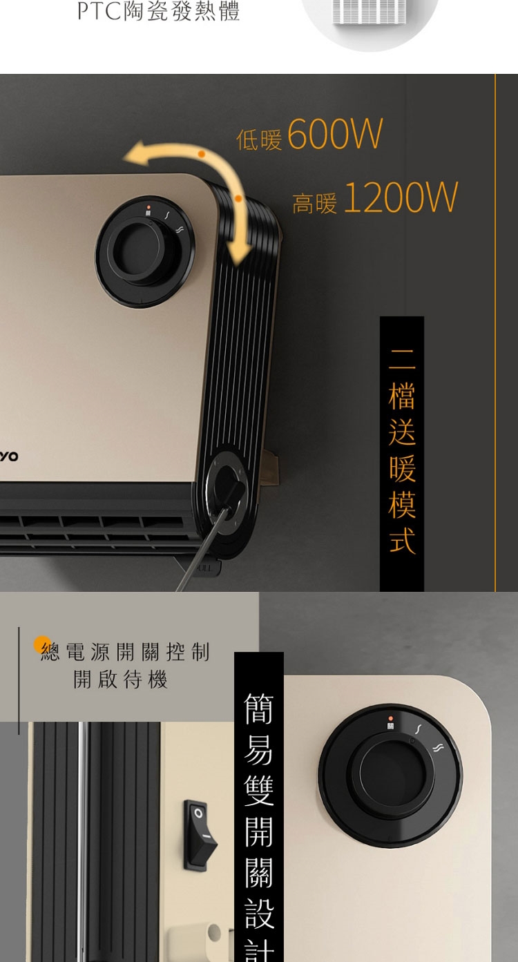 ★ 二檔送暖模式:低暖(600W)、高暖(1200W)