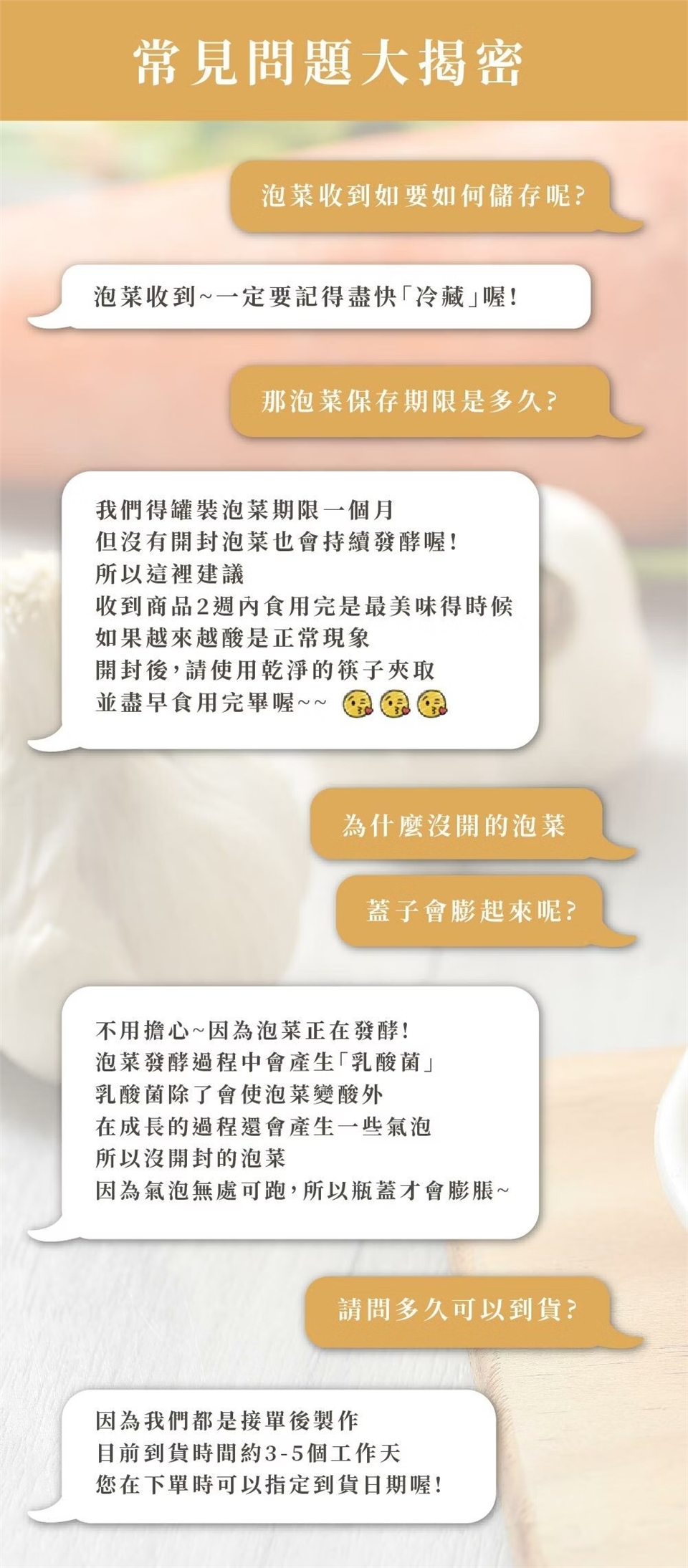 泡菜不含防腐劑,全程【低溫冷藏】宅配,收到後請盡速冷藏 泡菜【慢慢發酵變酸】為正常現象