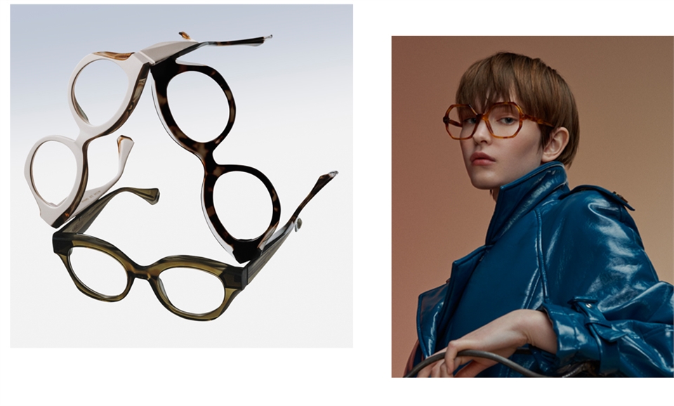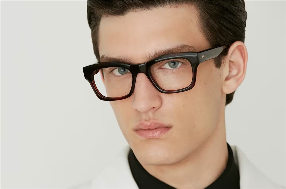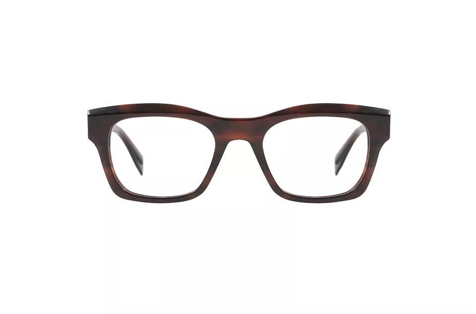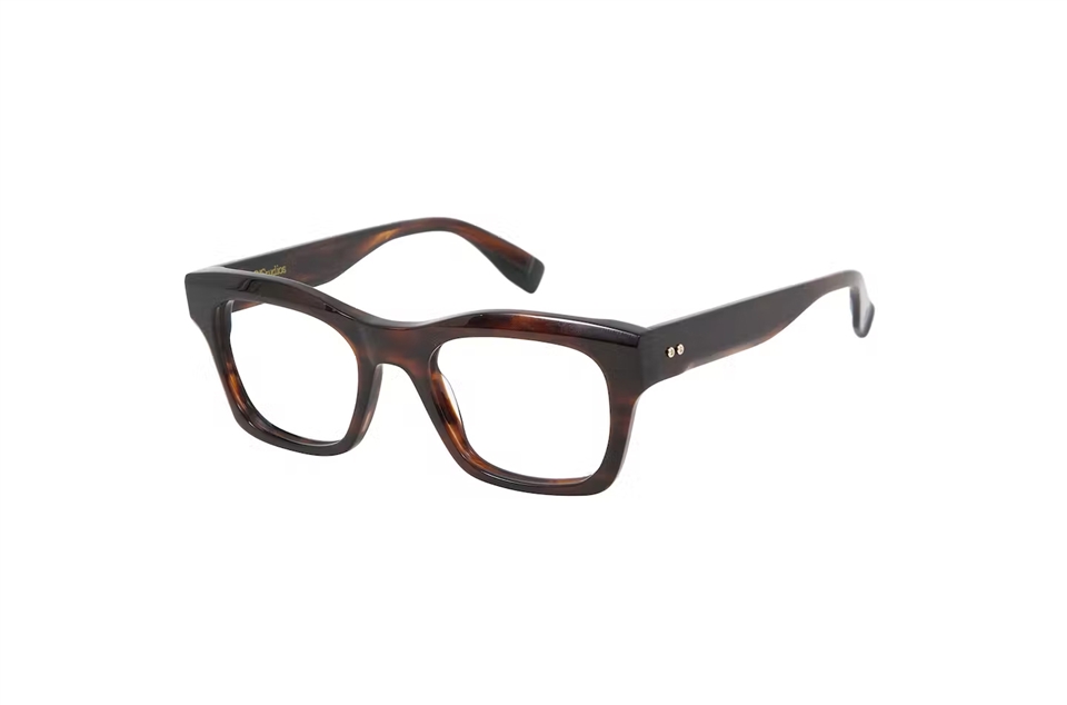 方形的義大利醋酸纖維款式/鏡框上緣有設計過的斜面/鏡腳上有一對亮眼的金屬裝飾