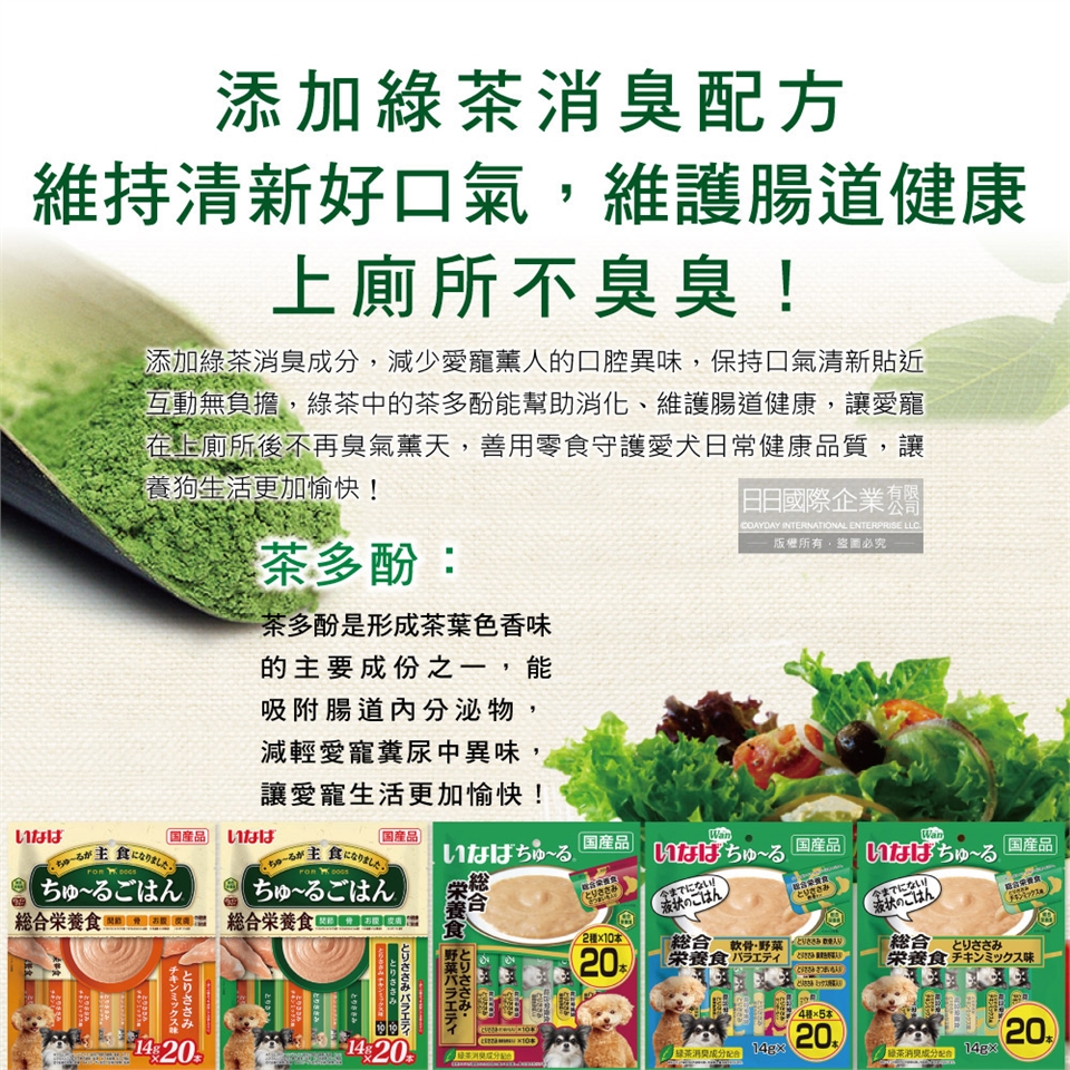 (5)雞肉口味(綠色袋):雞肉(雞柳)、雞肉脂肪、雞肉萃取物、酵母萃取物、蛋白質水解物、黏稠穩定劑(加工澱粉、增稠多醣類)、礦物質(Ca、Fe、Cu、Mn、Zn、I、K)、維生素(A、D₃、E、B₁、葉酸、B₁₂、膽鹼)、殼聚醣、紅麴色素、綠茶萃取物。