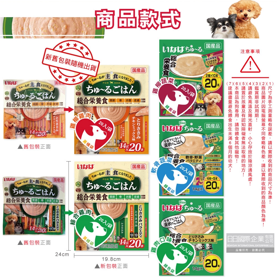 ●款式:雞柳雞肉(黃橘袋)、綜合雞肉(黃綠袋)、雞柳蔬菜(綠紫袋)、軟骨蔬菜(綠藍袋)、雞肉口味(綠色袋)