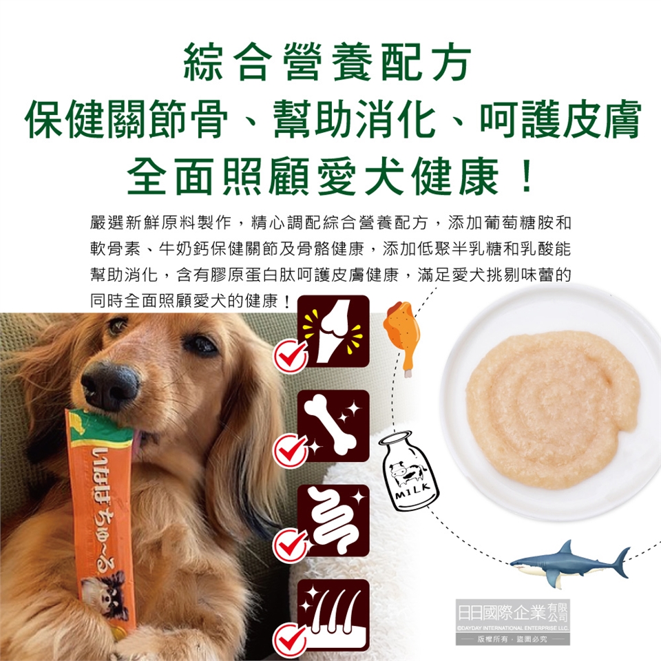 雞肉(雞柳)、雞肉脂肪、雞肉提取物、酵母提取物、低聚半乳糖、膠原蛋白肽、鯊魚軟骨提取物(含硫酸軟骨素)、奶鈣、酵母、滅菌乳酸菌、增稠劑(變性澱粉、增稠多醣)、礦物質(Ca、Fe、Cu、Mn、Zn、I、K、P、Mg)、維生素(A、D₃、E、B₁、B2、葉酸、膽鹼)、葡萄糖胺、紅麴色素。