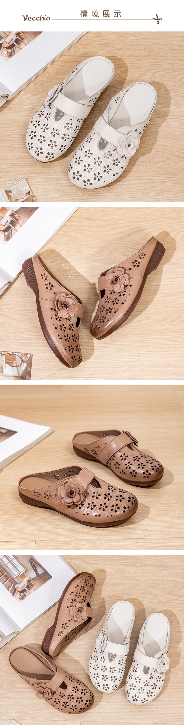 【VECCHIO】真皮縷空花朵低跟包頭拖鞋/真皮頭層牛皮縷空花朵舒適低跟圓頭包頭拖鞋 女鞋 2色任選