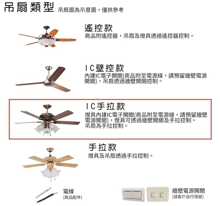8.內建 IC 電子開關(非遙控器) ※商品附至電線,請預留牆壁電源開關,吊扇透過牆壁開關控制,壁切開關請自行另購