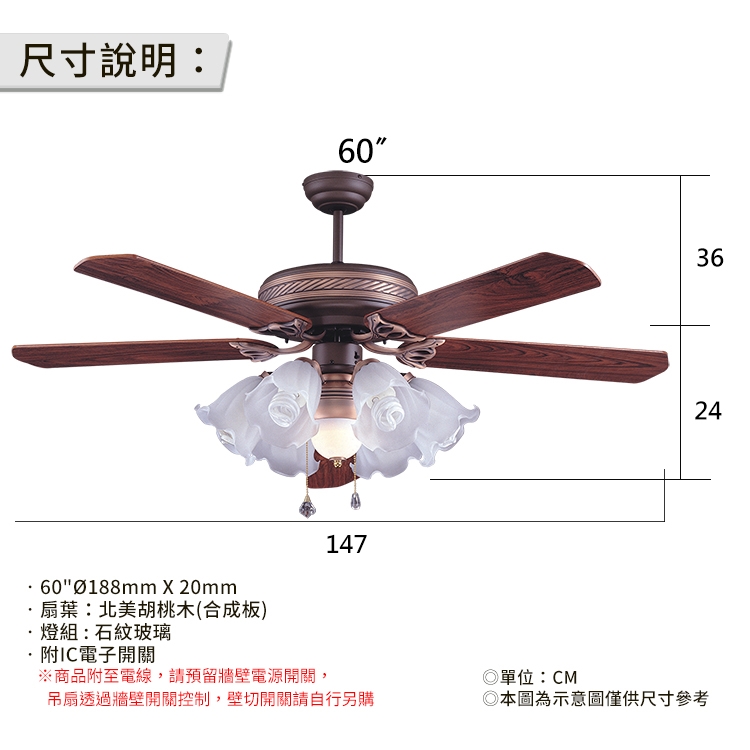 ※商品附至電線,請預留牆壁電源開關,吊扇透過牆壁開關控制,壁切開關請自行另購