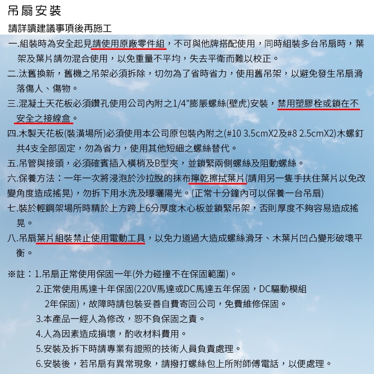 5.吊扇正常使用保固一年。(外力碰撞不在保固範圍內)