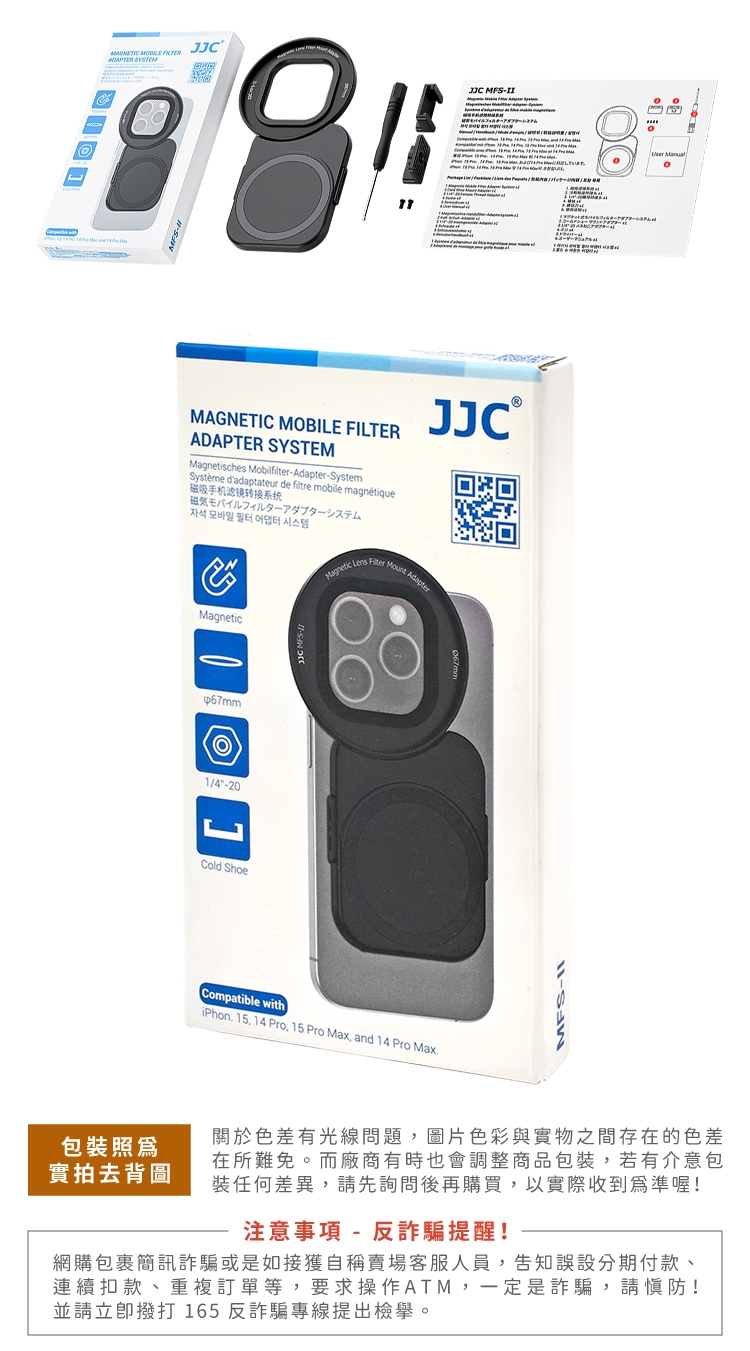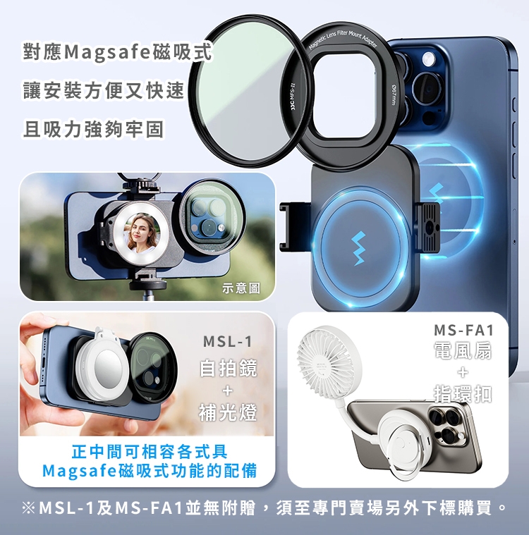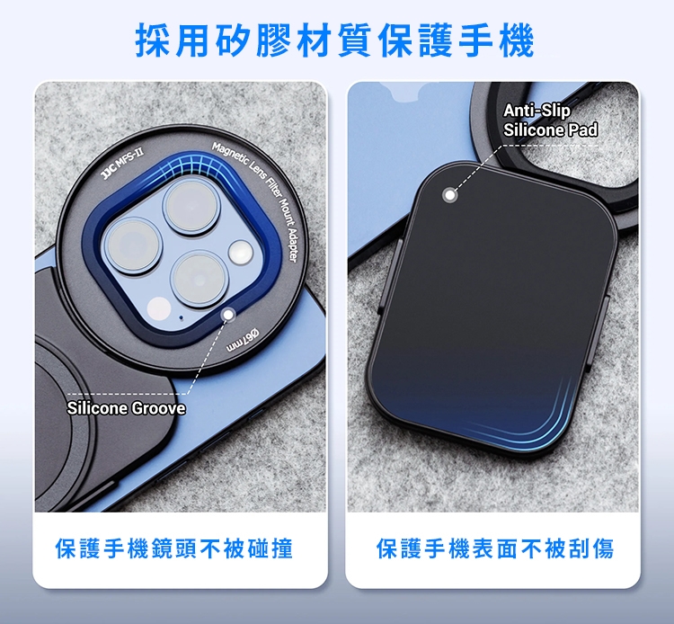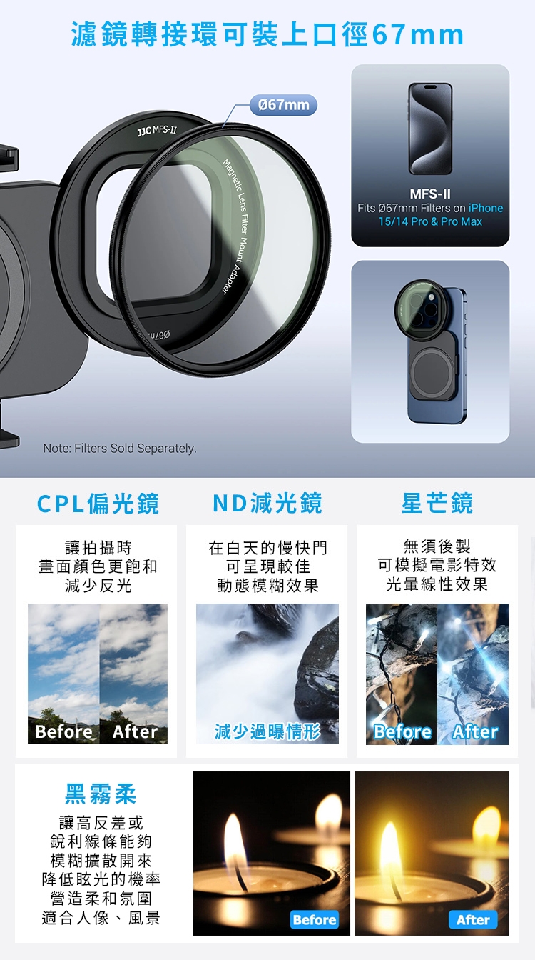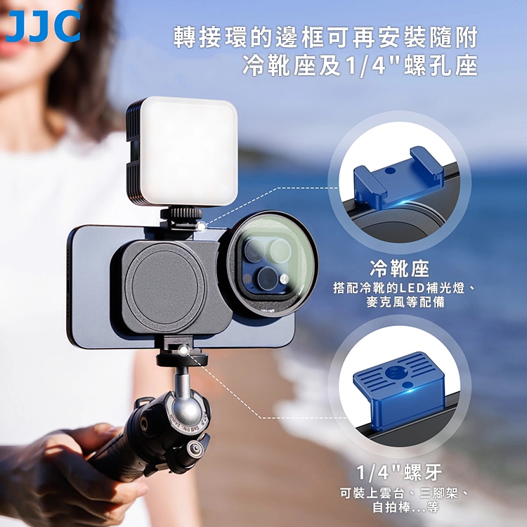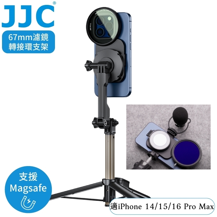 ●【品名】JJC吸磁鐵MagSafe蘋果Apple手機iPhone 14/15/16 Pro Max濾鏡轉接環支架MFS-II(適67mm濾鏡;附冷靴座.1/4"螺孔座)適攝錄影自拍片Vlog