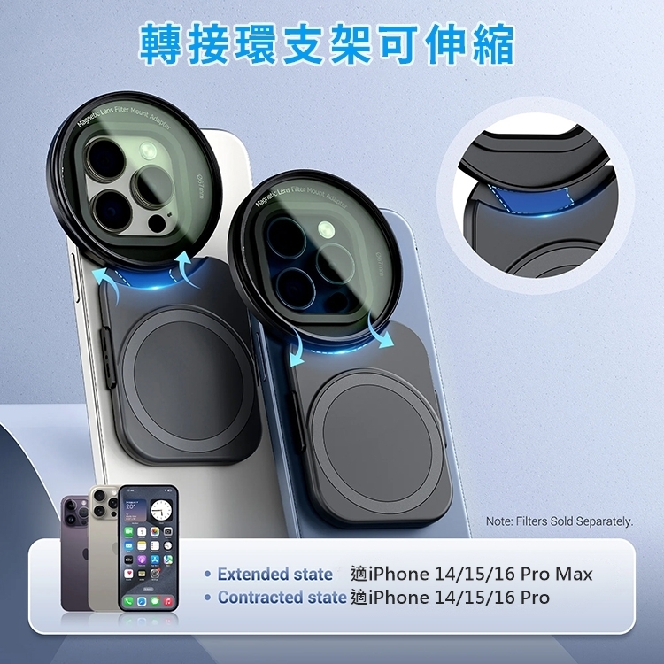 ●同時兼容Pro和Pro Max,轉接環支架可伸縮,可適應Pro跟Pro Max大小不同的差異。