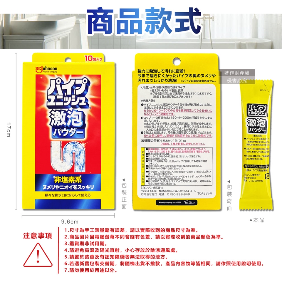 (10)請勿用於衣類、木製品及已堵塞的排水管等。
