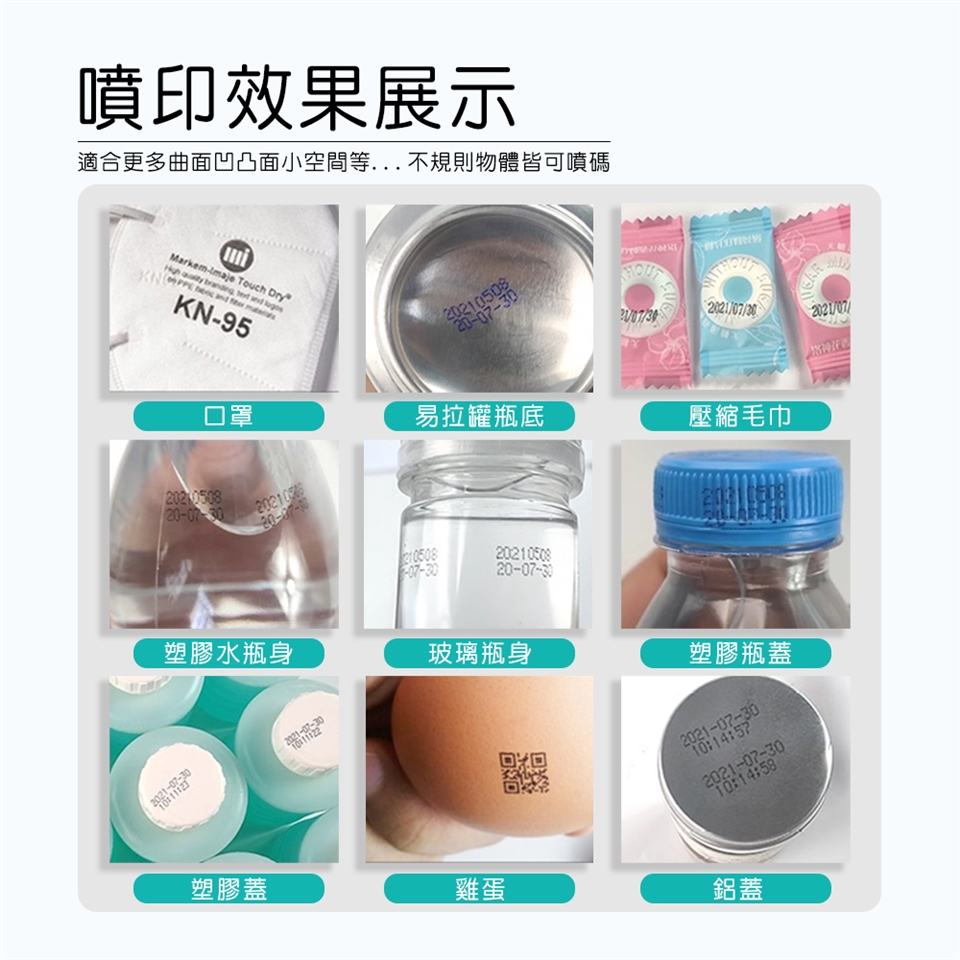 - 內容豐富:可在各種平面、凹凸面及曲面產品上進行噴碼,適應性強。