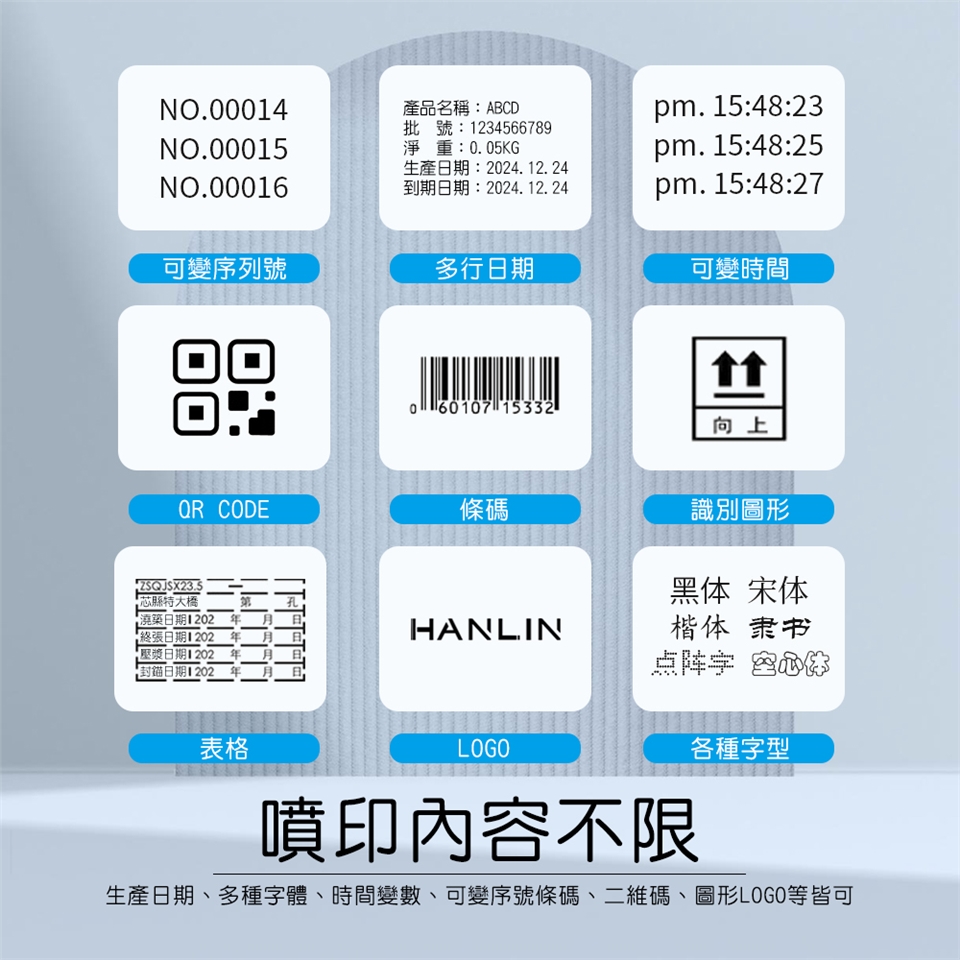 噴印內容:文字、圖形碼、日期、表格、圖形logo等