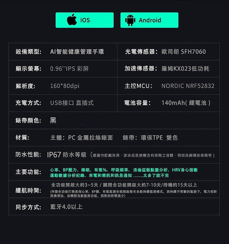 本產品為手機延伸之周邊消費性電子產品,做為手機功能輔助或延伸之周邊,非醫療器材,應用於運動訊息之收集監測。所有智能數據僅供參考,不具備醫療、診斷、緩和、療程、預防和臨床等相關用途。