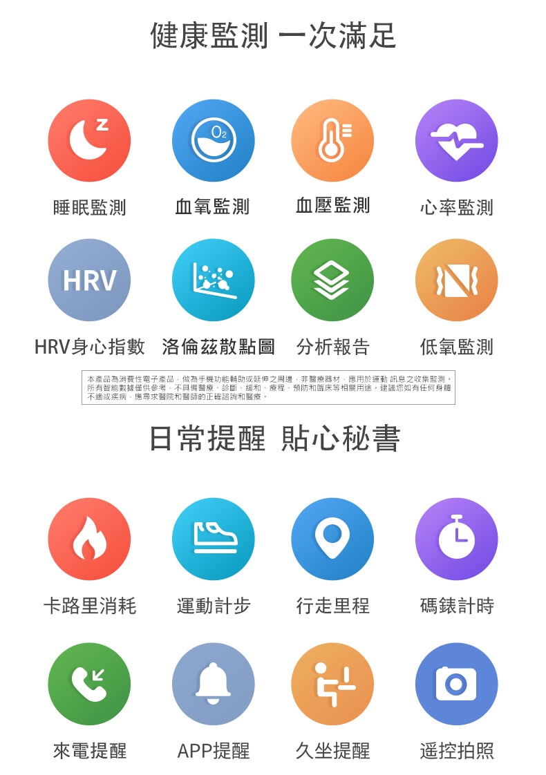 建議您如有任何身體不適或疾病,應尋求醫院和醫師的正確諮詢和醫療。如您購買本產品代表您已同意購買本產品僅用於運動相關監測及手機娛樂、通信等非關衛生或醫療等相關功能之延伸用途。