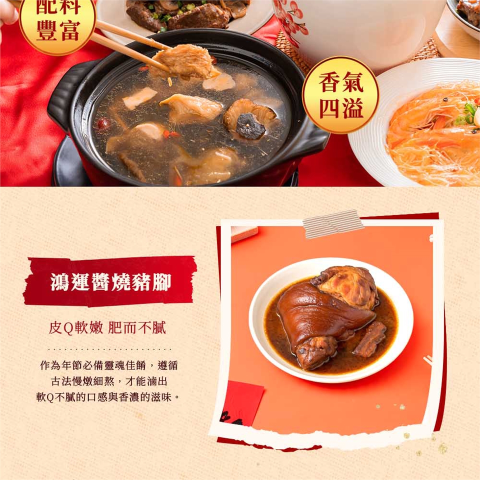 內容物: 鴻運醬燒豬腳:豬肉、大豆油、醬油、冰糖(砂糖、水)、紅麴醬(米、食鹽、紅粬)、味醂{果糖、水、糯米、米麴、糖、釀造酢、鹽、調味劑(胺基乙酸、檸檬酸鈉、DL-胺基丙酸、5'-次黃嘌呤核苷磷酸二鈉、5'-鳥嘌呤核苷磷酸二鈉)}、醋酸澱粉、蔥、蒜、味精、蔗糖、紅辣椒、甘草、白胡椒粉、紅麴粉(紅麴菌、米、水)、五香粉(肉桂、八角、小茴香、丁香、花椒)、肉桂粉(肉桂、甘草)、5'-次黃嘌呤核苷磷酸二鈉、5'-鳥嘌呤核苷磷酸二鈉。
