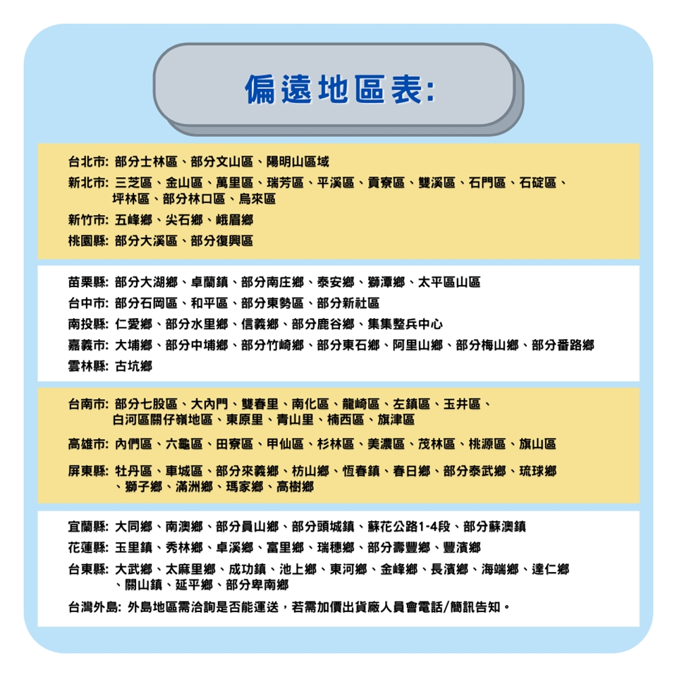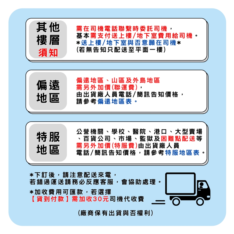 偏遠地區及山區另外報價 (依出貨廠商報價為主)。
