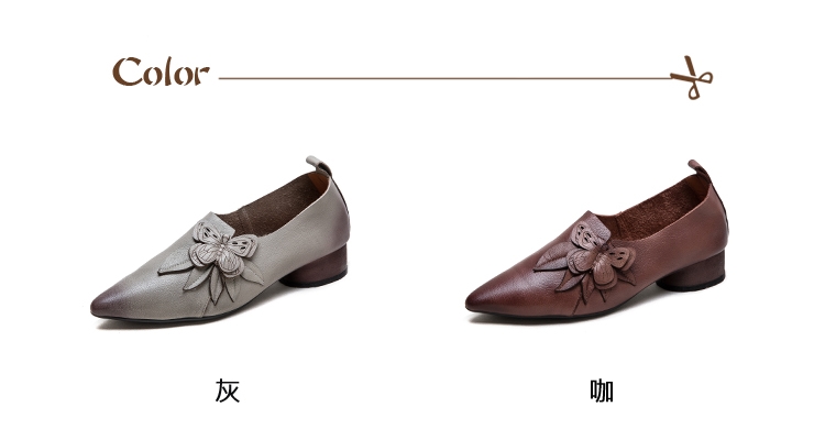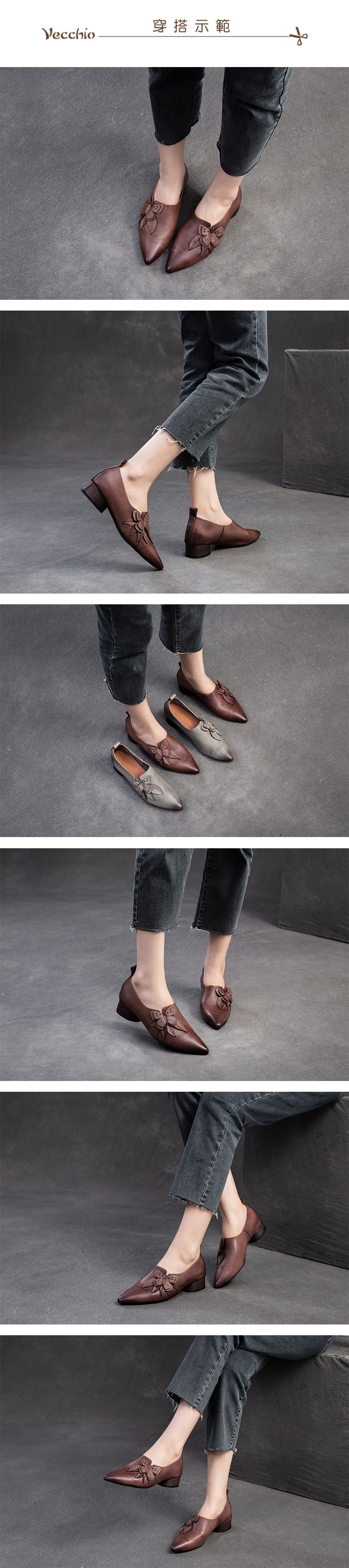【VECCHIO】全真皮尖頭花朵蝴蝶皮雕粗跟鞋/全真皮頭層牛皮尖頭立體花朵蝴蝶皮雕時尚粗跟鞋 女鞋 咖