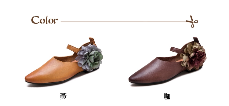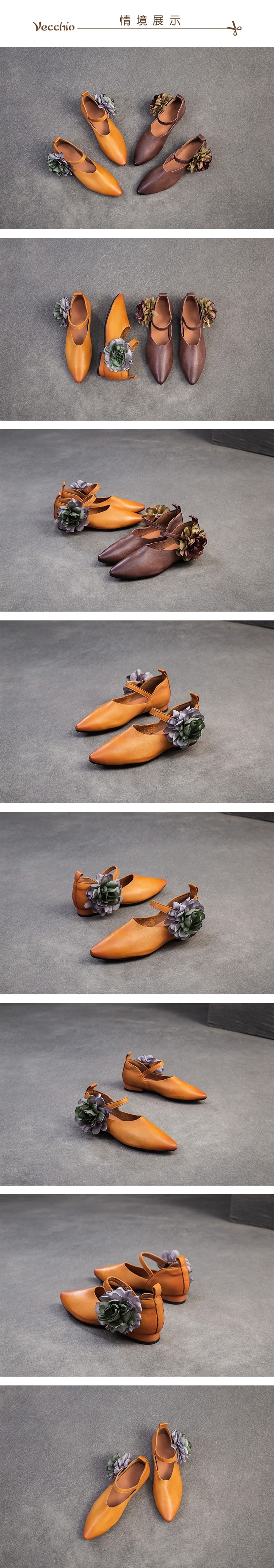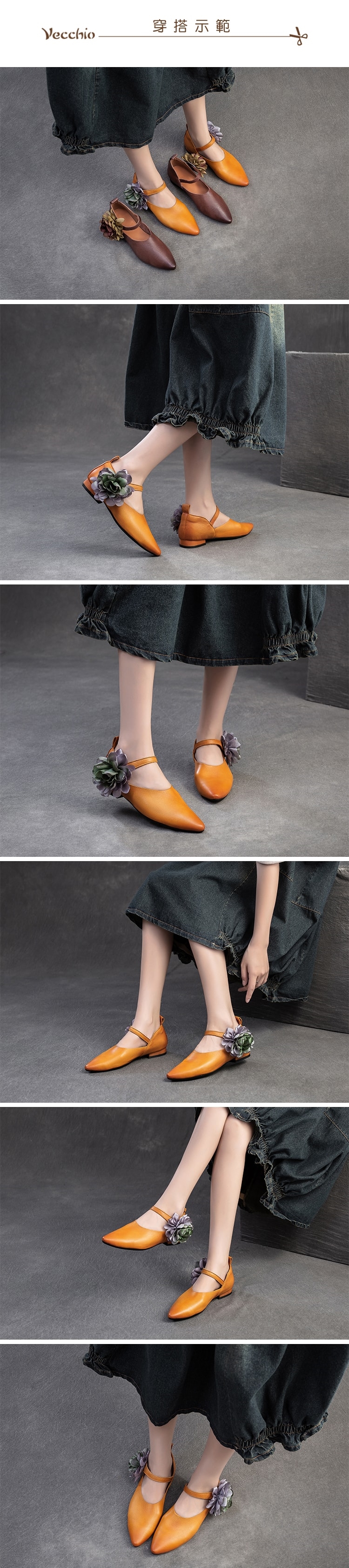 【VECCHIO】全真皮尖頭一字帶花朵低跟鞋/全真皮頭層牛皮尖頭一字帶立體花朵造型低跟鞋 女鞋 黃