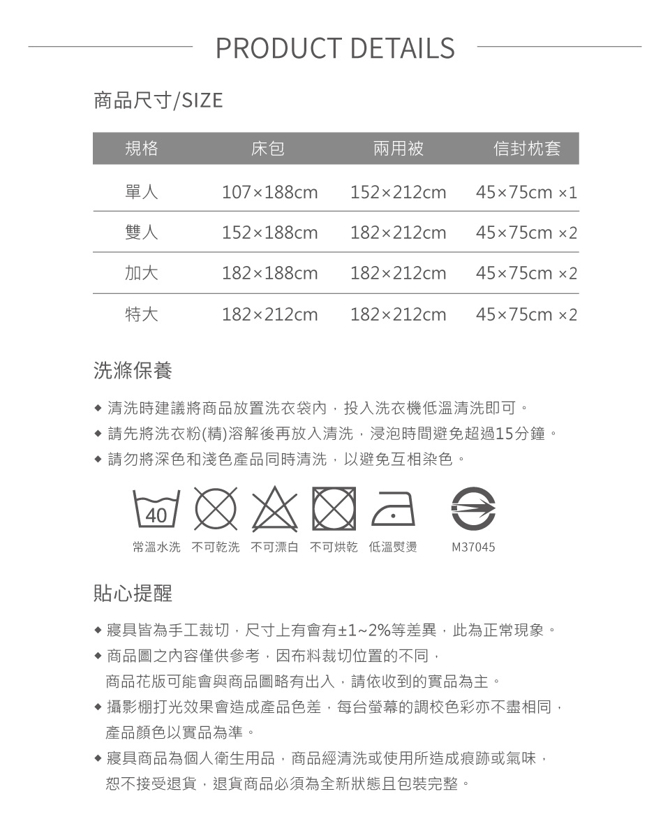 可水洗∕不可烘乾∕不可漂白∕勿使用強力漂白清潔劑∕浸泡時間請勿超過20分鐘∕建議可放入大型洗衣袋後再清洗