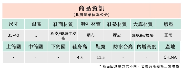 2.鞋類商品依功能及用途之不同,鞋底各有其止滑係數之個別不同,使用鞋類商品請用於正常平坦之路面,非雨鞋或雨靴類商品,請避免穿著於下雨濕滑路面上行走。