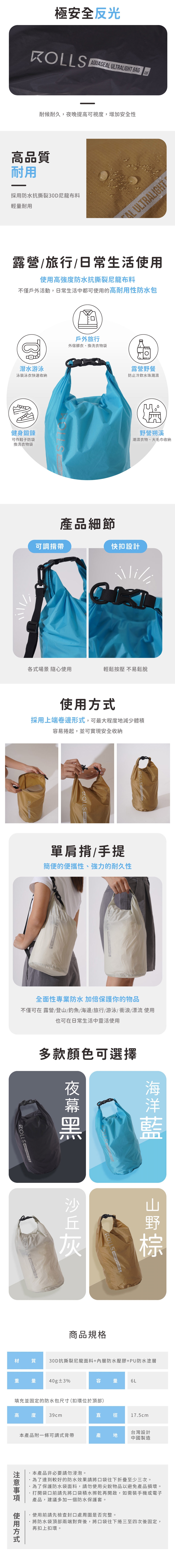 -將防水袋頂部兩端對齊後,將袋口往下捲三至四次後固定。再扣上扣環。