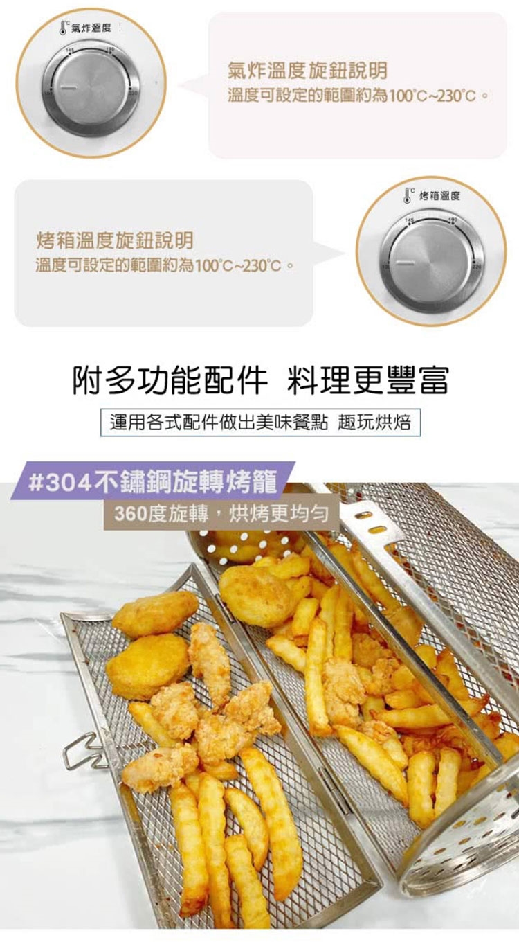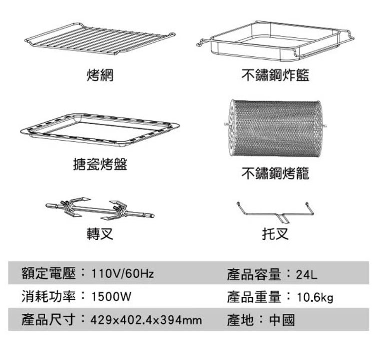 ◎ 附配件:旋轉烤叉、#304不鏽鋼旋轉烤籠、#304不鏽鋼炸籃、烤網、搪瓷烤盤、托叉