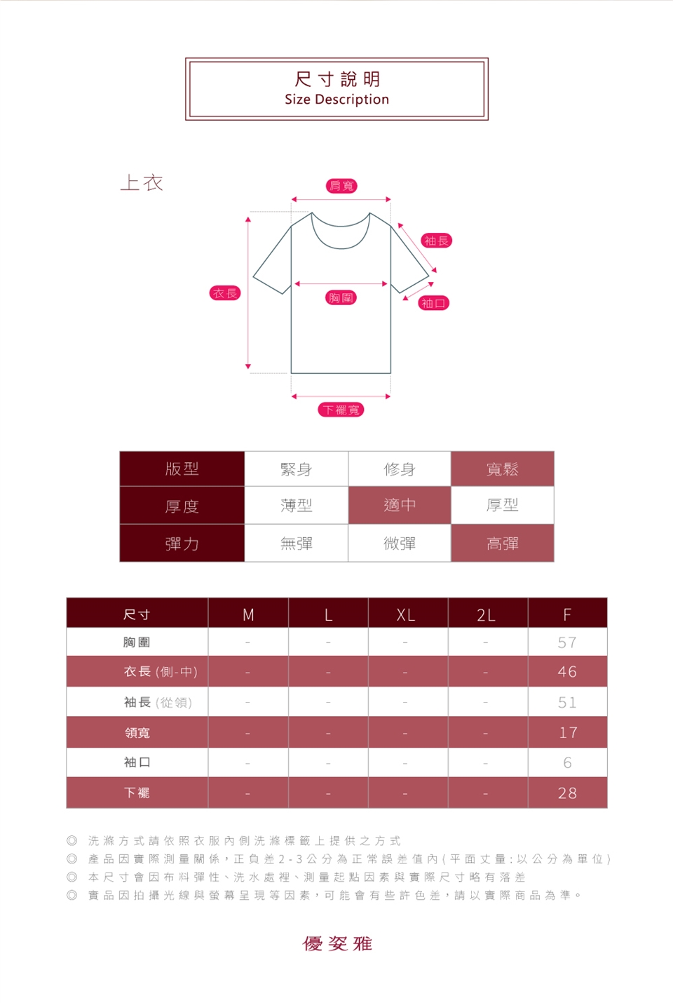 ※ 本尺寸會因布料彈性、洗水處裡、測量起點因素與實際尺寸略有落差