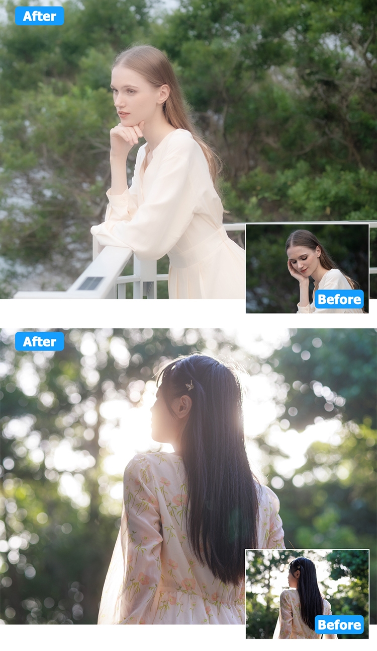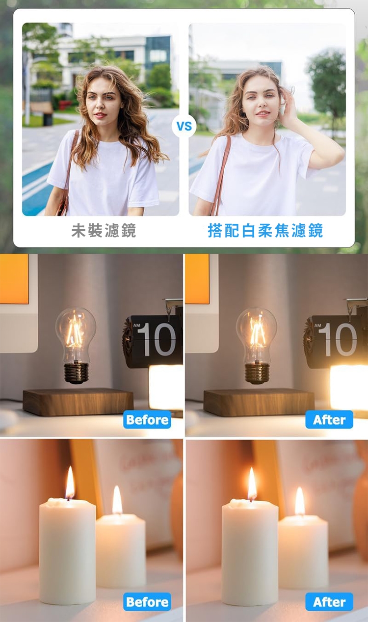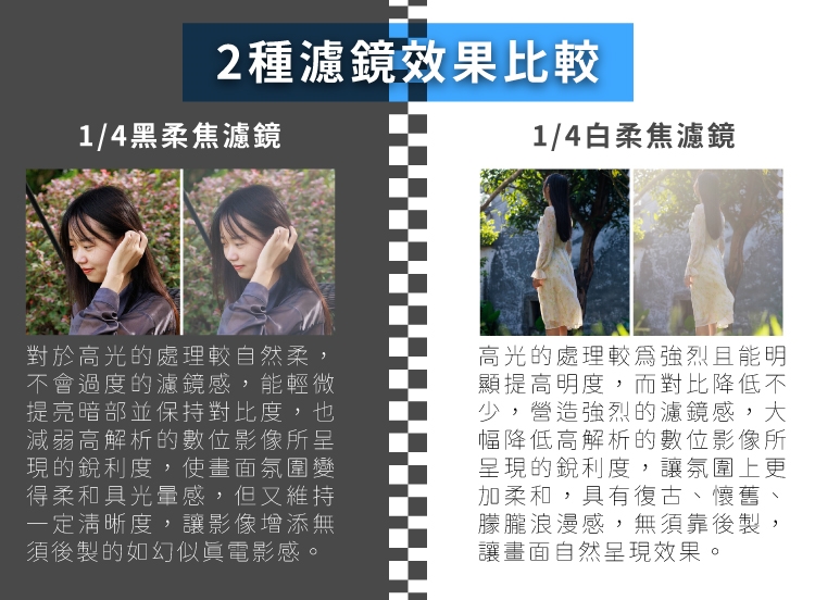 白柔焦濾鏡對於高光的處理相較黑柔會較為過度且能明顯提亮暗部並進而減少對比,可以有效的減少高解析數位影像呈現的過度銳利感,使畫面變得更為柔和且會稍微模糊,呈現朦朧的浪漫感。