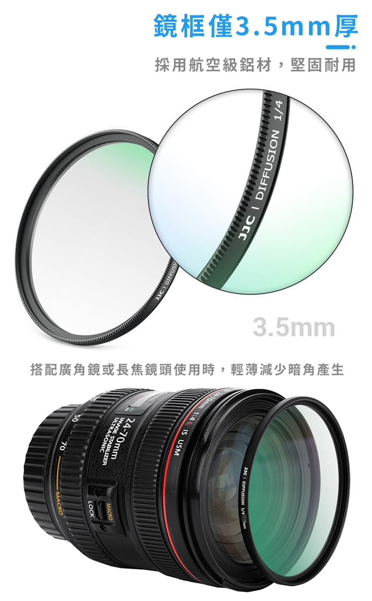 ●鏡框僅3.5mm厚且採用航空級鋁材,搭配一般廣角鏡或長焦鏡頭使用時,減少暗角發生的機會