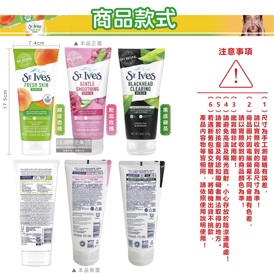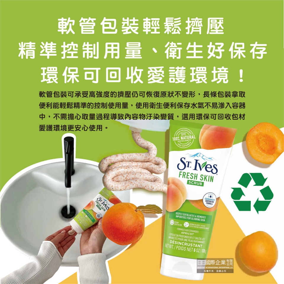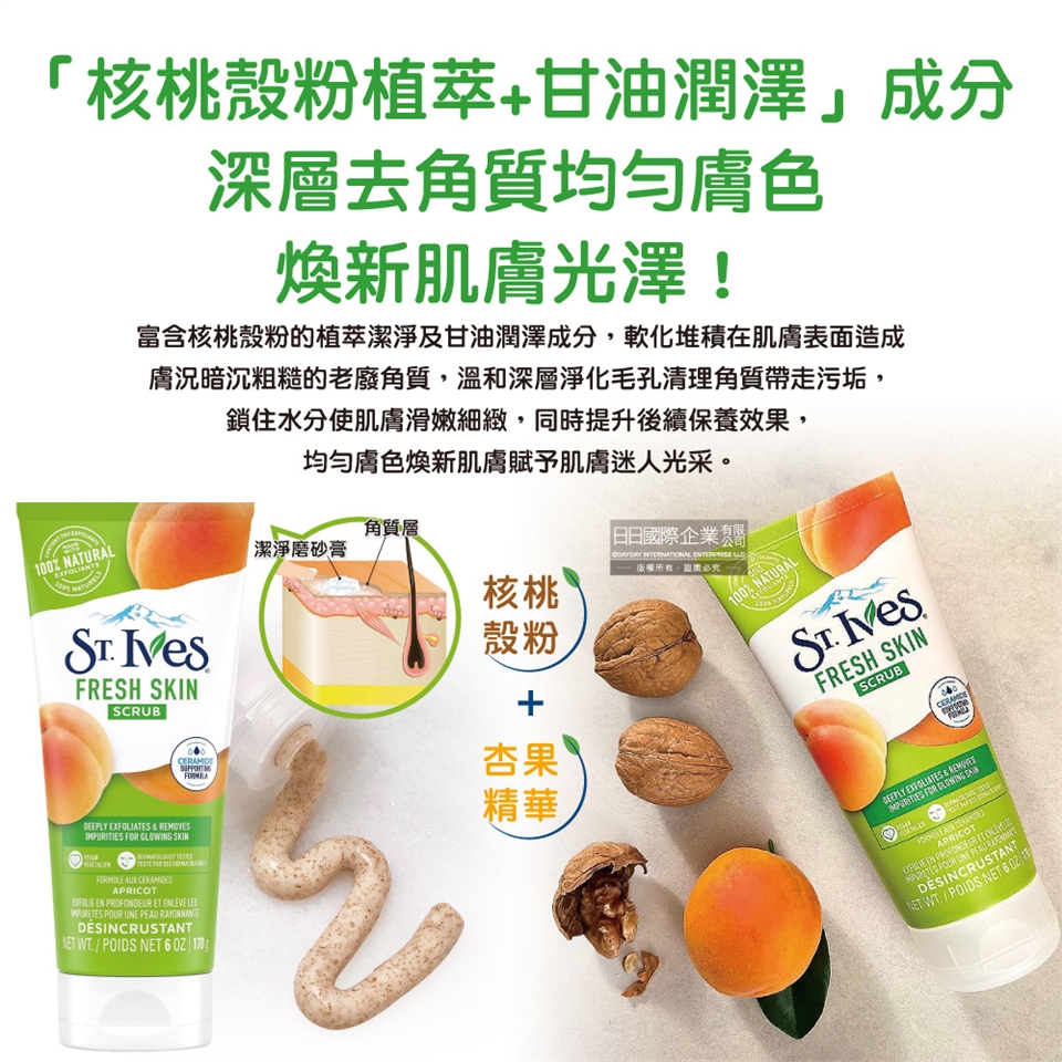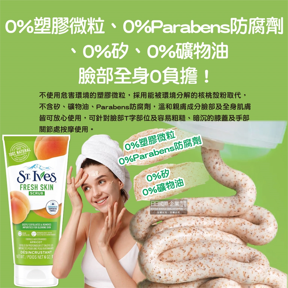 (1)綠底杏桃:純水、核桃殼粉、硬脂酸甘油酯SE、甘油、鯨蠟硬脂醇、玉米仁粉、鯨蠟醇、椰油醯胺丙基甜菜鹼、硬脂酸甘油酯、PEG-100 硬脂酸酯、卡波姆、鯨蠟硬脂醇聚醚20、聚山梨醇酯60、三乙醇胺、乙二胺四乙酸二鈉、香料、碘代丙炔基丁基氨基甲酸酯、苯氧乙醇、水楊酸芐酯、李子杏籽粉、杏果萃取、檸檬烯、芳樟醇、二氧化鈦(CI 77891)。