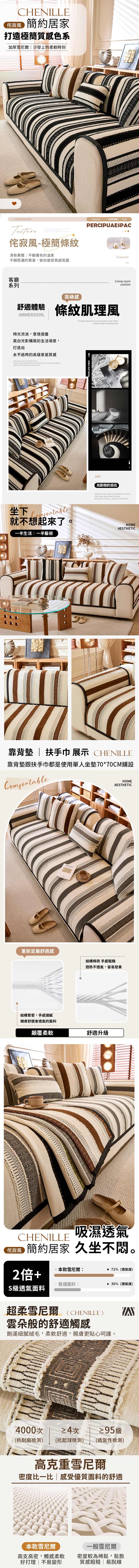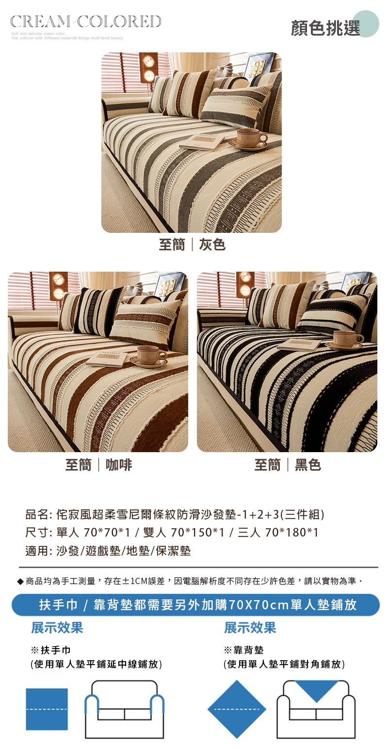 侘寂風超柔至簡直條紋防滑雪尼爾沙發墊-1+2+3人坐墊(三入組)